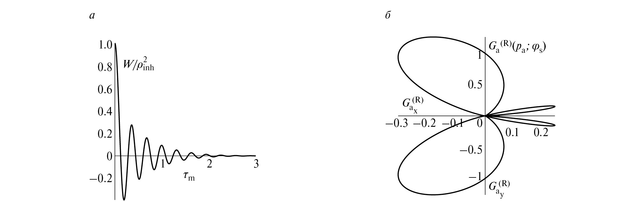 Рис. 3. Коррелятор (3), (14) – (23), (29), который дает сильную анизотропию и нули рассеяния в рэлеевском пределе p << 1, определяемые новыми топологическими законами (25), (26) с обязательным нарушением частотного рэлеевского закона для длинноволнового рассеяния (а). Значения параметров те же, что и для рис. 1д, но m11 = 1; m12 = 2; m13 = 3 (17). Сильная анизотропия и нули углового распределения рассеяния волны Рэлея в рэлеевском пределе (б). Нарушение как чисто рэлеевской [1, 5] изотропии углового распределения рассеяния, представленной на рис. 2б, и характерной анизотропии рэлеевского рассеяния в виде сдвинутой вперед изотропной окружности углового распределения в полярных координатах, представленной на рис. 2а, так и топологической симметрии законов (25), (26) в целом.