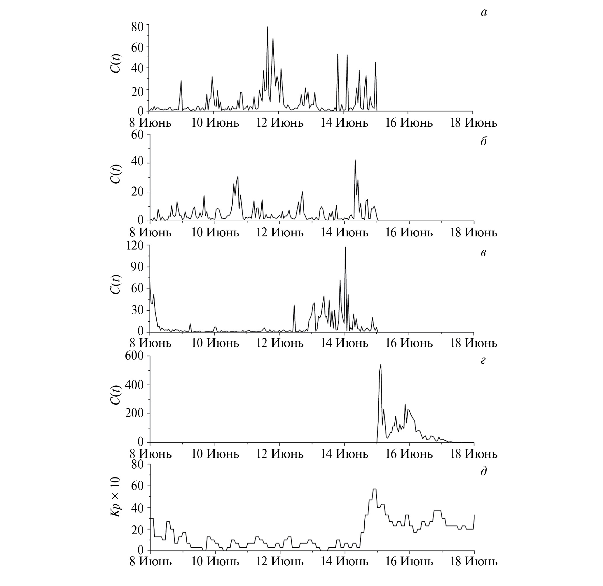 Для проверки методики проведена обработка семи рядов N(t) сети НМ в период времени с 01 по 30 июня 2008 г. На этом отрезке 14 июня зарегистрирована геомагнитная буря класса G1. Наземные НМ размещены на разных континентах: в Европе (LMKS, MOSC), в Азии (AATB, NANM) и в Америке (MXCO, CALG). Для рядов N(t) с поправкой на давление были вычислены значения C(t). Видно (рис. 1а, 1б и 1в), что для всех НМ возникли «всплески» в рядах C(t) в течение 11–14 июня, которые опережали (рис. 1в) в среднем на 2 дня появление МКВМ на орбите Земли. Положение предикторов от отдельных НМ немного сдвинуто во времени из-за вращения Земли. Большой «всплеск» значений C(t) 15–16 июня совпадает с регистрацией форбуш-эффекта (рис. 1г). Следует отметить, что геофизический фон (индекс Кр) оставался на низком уровне на всем предшествующем интервале времени, вплоть до начала геомагнитной бури.