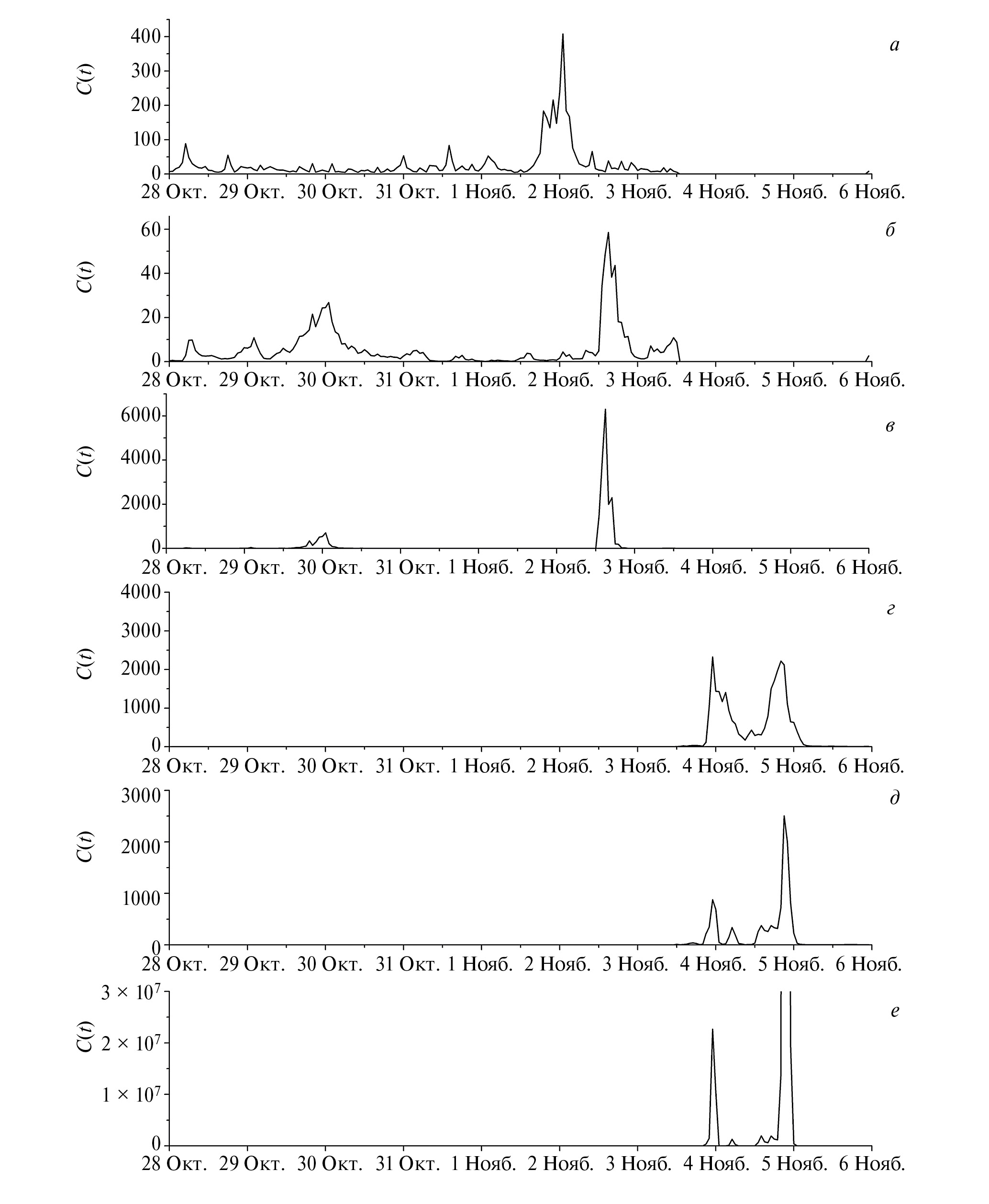 Рис. 2. Анализ события 04.11.2021 г.: почленная сумма C(t) семи рядов НМ (CALM, JUNG1, LMKS, AATB, YKTK, MXCO, NEWK) (а), ряды C(t) для суммы и произведения трех «кольцевых» рядов годоскопа УРАГАН (усл. ед.) (б, в). Данные (а, б, в) показаны на интервале 28 октября – 03 ноября в качестве предикторов. Данные (г, д, е) соответствуют появлению «всплесков» после предиктора 03–05 ноября во время форбуш-эффекта. Ось абсцисс – отрезок времени 28 октября – 05 ноября 2021 г.