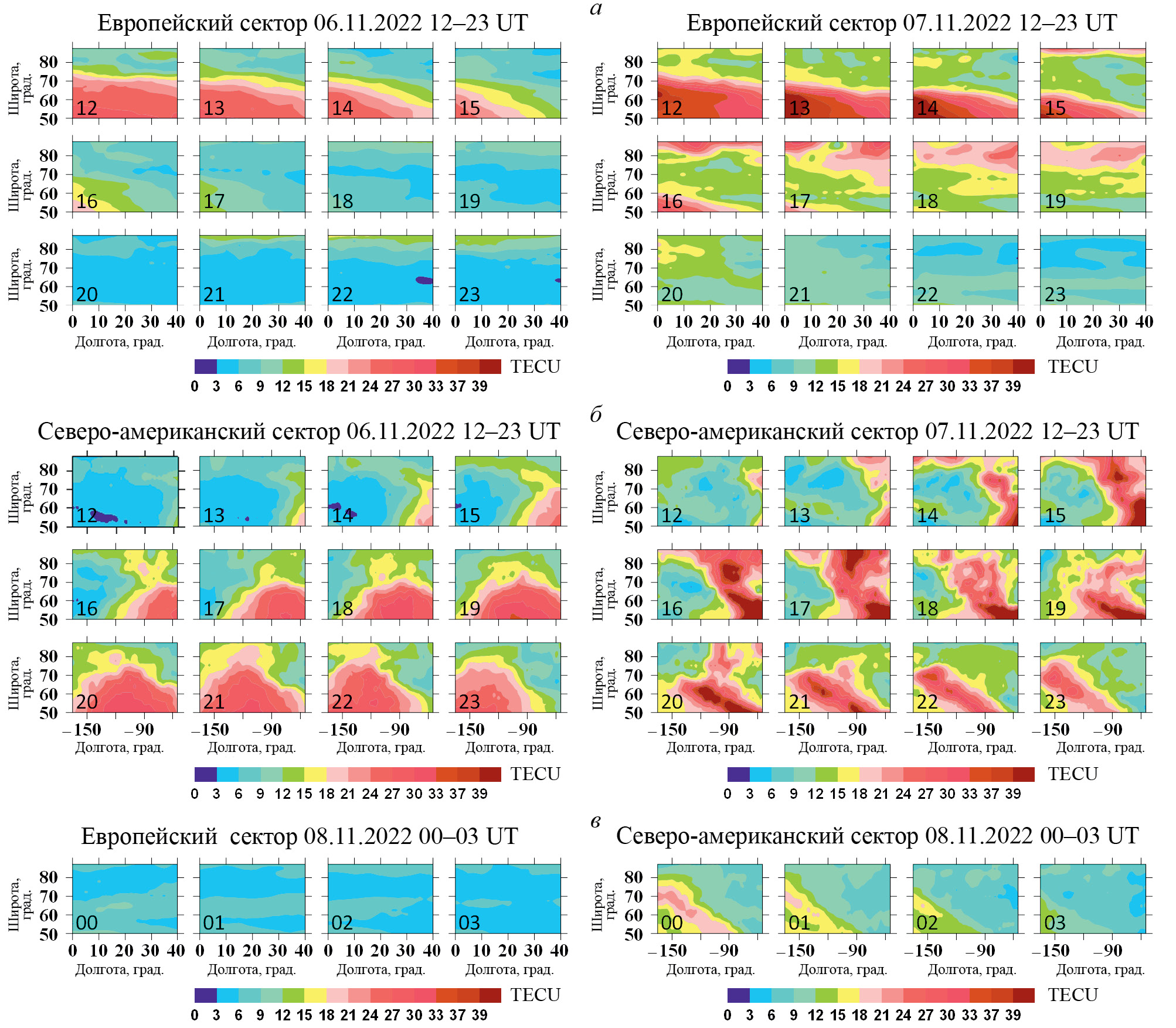 Рис. 2. Карты TEC с часовым интервалом для европейского (а) и американского (б) секторов за 6 и 7 ноября 2022 г. Карты для обоих секторов за 8 ноября в интервале 00—03 UT (в)