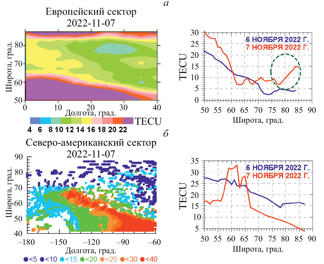 По данным TEC получена детальная картина пространственно-временного развития ионосферных возмущений во время умеренной по интенсивности бури 7 ноября 2022 г. Показаны особенности развития ионосферной бури в европейском и американском секторах. В обоих долготных секторах на стадии активной фазы бури на обоих секторах в послеполуденные часы наблюдалось положительное возмущение TEC, которое свидетельствует о проявлении эффекта SED (Storm Enhanced Density). В европейском секторе обнаружена высокая электронная концентрация на широтах выше 75° с.ш., которая наблюдалась в евроазиатском секторе в послеполуденное/вечернее время. Структура была ассоциирована с языком ионизации (TOI). На основе полярных карт показано, как плазма перемещалась через полярную шапку с дневной стороны ионосферы в ночную, где величина TEC превышала 15 TECU. Повышение TEC составляло более чем в 2 раза относительно спокойного дня.
