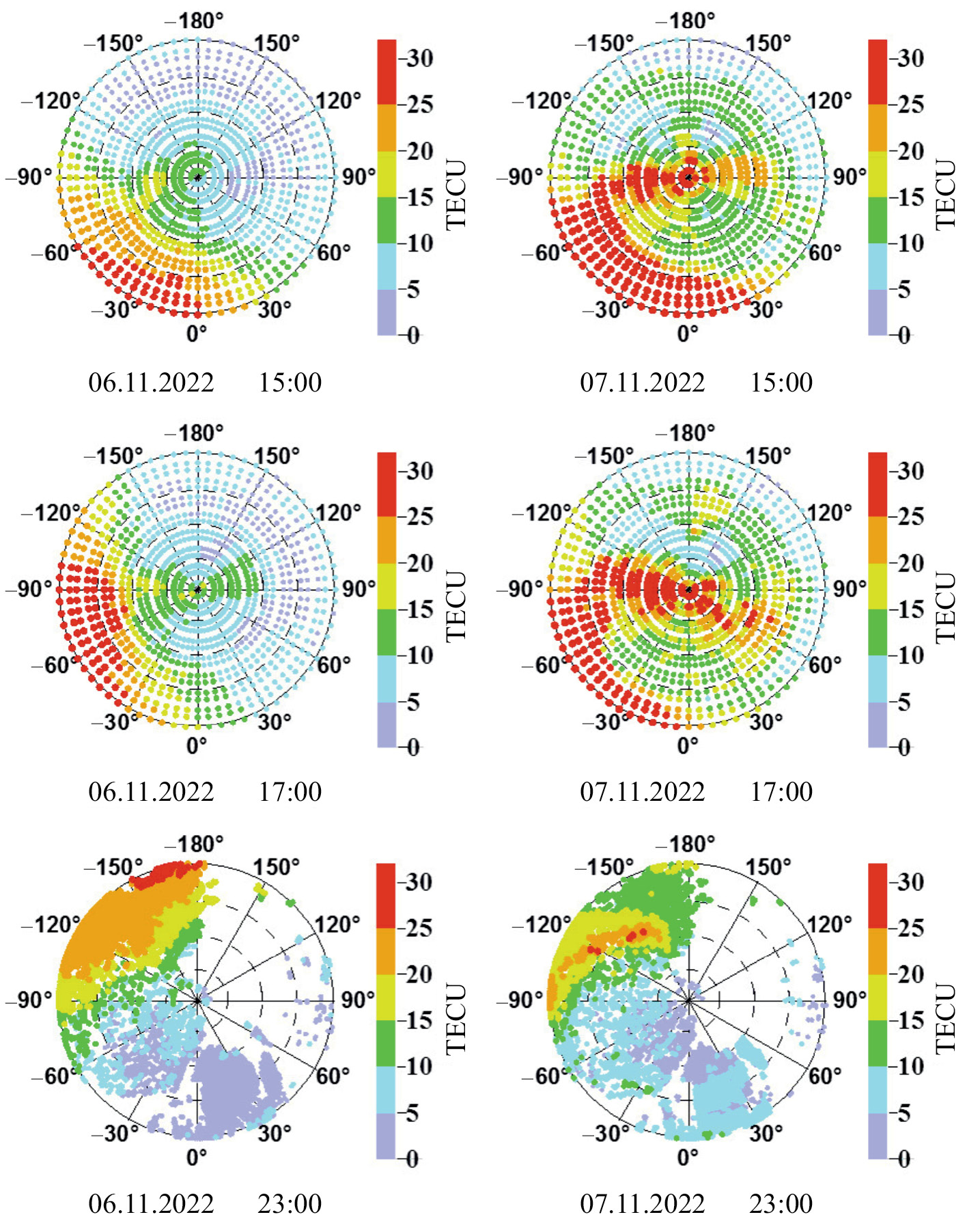 Для рассматриваемой бури 7 ноября 2022 г. мы видели, что TOI-структура проявилась после 15 UT в евроазиатском секторе (см. рис. 3). На рис. 4 для 15UT явно прослеживается перемещение плазмы через полярную шапку из дневного в ночной сектор на долготах около 90° в.д.. Аномальное повышение электронной концентрации распространилось до широт ~ 65° с.ш. Величина TEC в 2—3 раза превышала уровень спокойного дня 6 ноября. В 17 UT повышение продвинулось в вечерний сектор на долготы ~ 60° в.д. и проявилось на более низких широтах ~60° с.ш. При этом интенсивность языка ионизации TOI выросла и расширился его долготный размер в полярной шапке. Величина TEC на широте 60° с.ш. превышала 15 TECU.