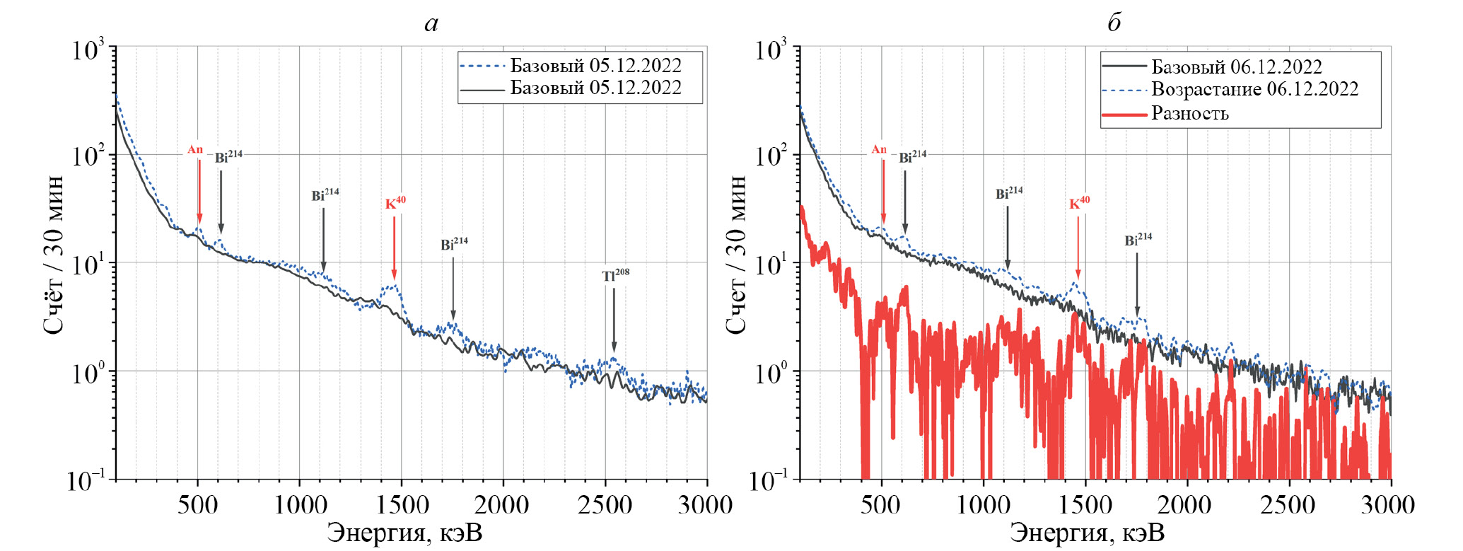 Спектрометр, размещенный в свинцовом стакане и работающий в непрерывном режиме измерения спектра электромагнитного излучения, был накрыт пластиковой емкостью с чистой водопроводной водой, до этого отстаивавшейся в плотно закрытой таре около месяца. Отстой воды проводился для того, чтобы короткоживущие радионуклиды (к примеру, радон) полностью распались, если они присутствуют в воде. Хотя наличие каких-либо радионуклидов в воде выявил бы сам спектрометр, показав соответствующие линии, отсутствие новых линий на спектре предпочтительнее. Толщина слоя воды составляла 15 см. Такой слой воды, согласно [14], ослабляет поток квантов примерно в 2—2.5 раза в нашем рабочем диапазоне энергий — до 3000 кэВ. На рис. 3 приведены спектры. Рис. 3а показывает базовые спектры, полученные с открытым спектрометром 05.12.2022, и 06.12.2022 уже с накрытым слоем воды. При этом поток ЭМК контролировался также сцинтилляционным детектором с интегральными выходными каналами. По данным интегрального детектора (описание установки мониторинга ЭМК дано в [5]), в канале >100 кэВ в течение 5 и 6 декабря держался постоянный уровень, пока в середине дня 6 декабря не началось возрастание, вызванное интенсивным снегопадом. Можно видеть, что линии висмута-214 и калия-40, а также аннигиляционная линия 511 кэВ на втором спектре подавлены: слой воды существенно поглотил излучение. Однако сам спектр от 500 до 3000 кэВ такому ослаблению не подвергся, спектры в этом диапазоне энергий практически совпадают. При энергиях <500 кэВ наблюдается ослабление примерно в 2 раза. Из этого следует, что излучение <500 кэВ, а также излучение от радионуклидов действительно проходят через слой воды перед попаданием в кристалл детектора, следовательно, их источники находятся вдали от спектрометра. Поток же ЭМК с непрерывным спектром с энергиями >500 кэВ не изменился! Это означает, что либо эта часть ЭМК производится в непосредственном окружении детектора под слоем воды, либо в слое воды происходит дополнительная генерация излучения, компенсирующая поглощение. Такой механизм известен: образование каскадов высокоэнергичными мюонами [12, 15] в веществе.
