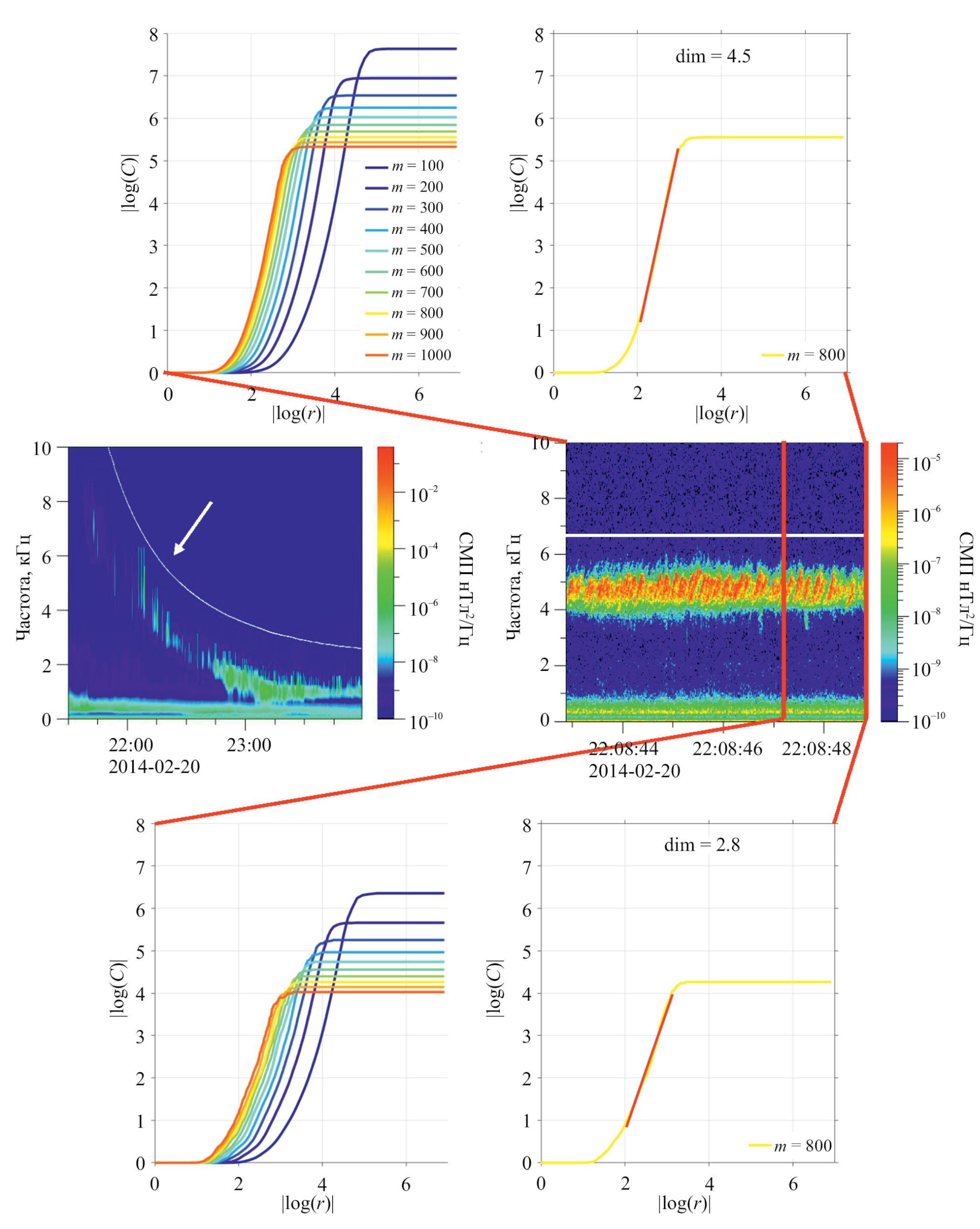 На верхних панелях рис. 1 и рис. 2 показаны результаты расчетов размерностей на всем временном интервале, которые оказались равными dim = 4.4 и dim = 4.5. Поскольку в работе использовались данные с высоким временным разрешением, то точек даже в пределах фрагмента всплеска хоров достаточно для вычисления размерности. На нижних панелях рис. 1 и рис. 2 показаны результаты расчета размерностей для фрагмента временного интервала, которые оказались значительно меньшими: dim = 2.9 и dim = 2.8. Всего при выполнении работы нами была проанализирована величина размерности для более чем 30 всплесков хоров разного типа. Во всех случаях размерность лежала в интервале