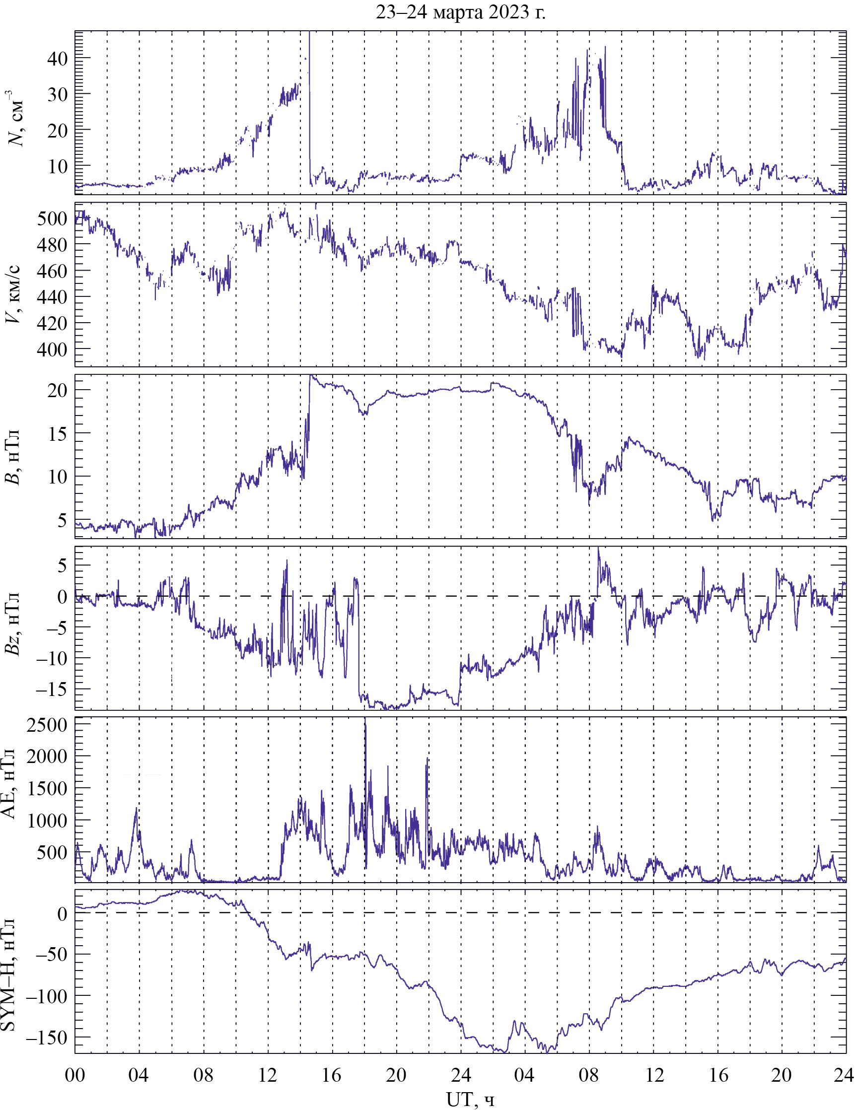 Магнитная буря 23—24 марта 2023 г. стала одной из наиболее сильных магнитных бурь за последний пять лет (Dst = –163 нТл, SYM-H = –170 нТл). Данная буря является нетипичной для CME (coronal mass ejection) бури: начало магнитной бури не сопровождалось приходом межпланетной ударной волны. Примерно в 14 UT был зафиксирован приход тангенциального разрыва, который характеризовался резким ростом модуля ММП B и резким уменьшением концентрации солнечного ветра, по данным базы OMNI (рис. 1). Данная буря могла быть вызвана взаимодействием края магнитного облака с магнитосферой Земли (ripple effect). Вследствие эффекта Рассела—Макферона относительно небольшое возмущение в солнечном ветре в период равноденствия могло стать причиной сильной магнитной бури [17].