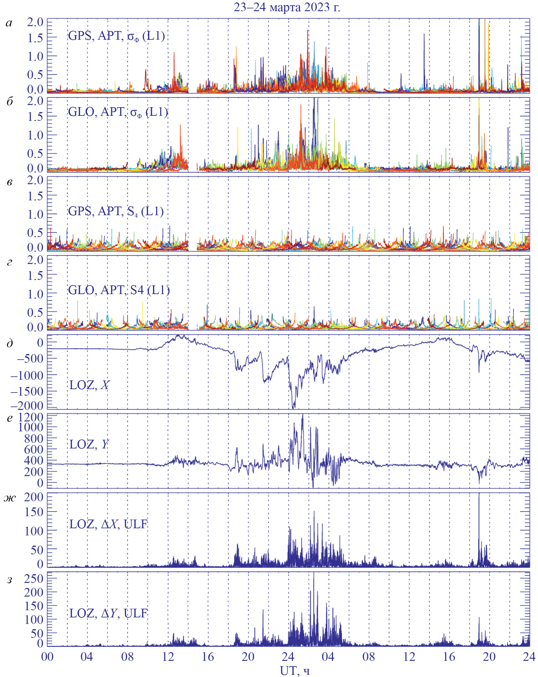 По данным магнитометра LOZ (рис. 2) суббуревая активность в виде последовательных отрицательных бухт в X-компоненте геомагнитного поля наблюдалась с 18 UT 23 марта до 06 UT 24 марта. Амплитуда наиболее мощной суббури в 00—02 UT достигала 1600 нТл. Появление данных суббурь происходило в период наибольшей интенсивности магнитной бури (минимум SYM-H-индекса). Положительная бухта в магнитном поле, связанная с развитием восточного электроджета, была зарегистрирована в 10—16 UT. Также небольшая суббуря (∆X ≈ 600 нТл) была зарегистрирована в 20 UT.