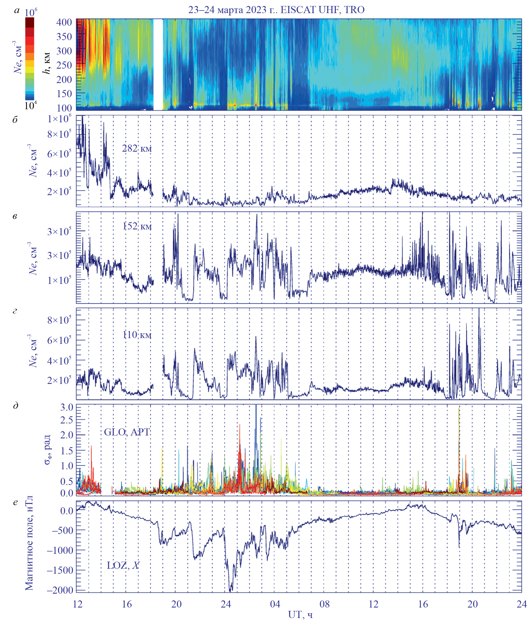 Для определения вклада различных ионосферных возмущений в рост ГНСС-сцинтилляций были проанализированы данные радара EISCAT UHF в Тромсё. На рис. 3 (панель а) показано высотное распределение концентрации ионосферной плазмы Ne. До 12 UT 23 марта 2023 г. наблюдался рост Ne, вызванный электромагнитным излучением Солнца. Поэтому данный временной интервал не показан на рис. 3.