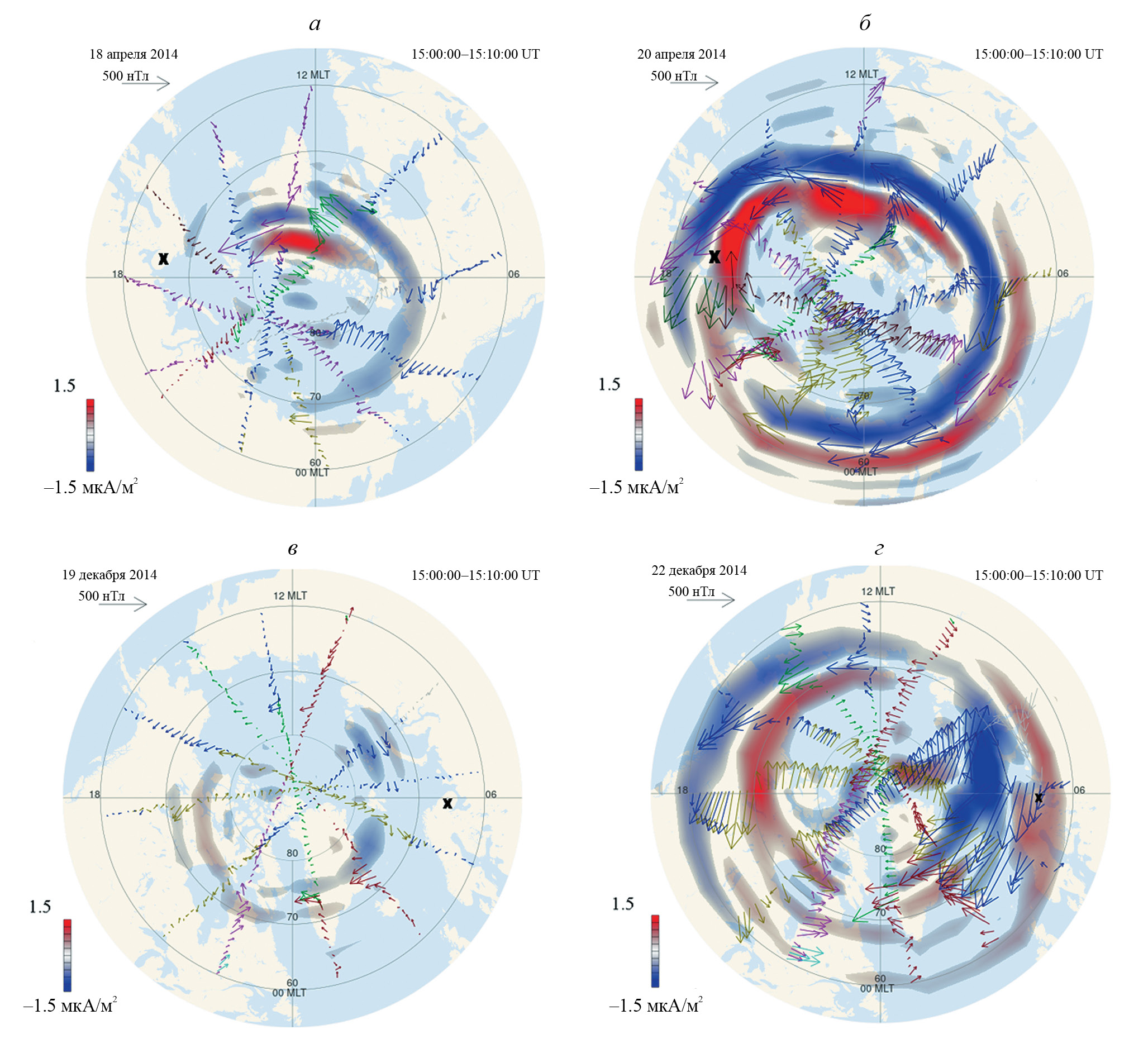 Рис. 2. Диаграммы геомагнитных данных, полученных со спутников Iridium в рамках проекта AMPERE (получены с сайта https://ampere.jhuapl.edu): для спокойного дня 18.04.2014 (15 ч по UT) (а), для дня с повышенной геомагнитной активностью 20.04.2014 (б); для спокойного дня 19.12.2014 (03 ч по UT) (в), для дня с повышенной геомагнитной активностью 22.12.2014 (г). Крестом на диаграммах обозначено местоположение индукционного магнитометра в геофизической обсерватории ПГИ “Ловозеро”