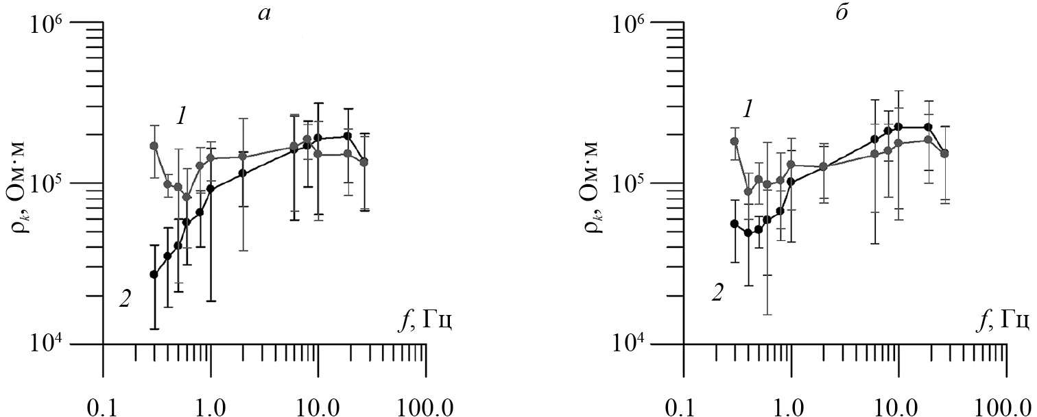 Рис. 3. Графики зависимости кажущегося сопротивления среды ρk от частоты естественного электромагнитного поля f, рассчитанные через значения импеданса по данным индукционного магнитометра, расположенного в геофизической обсерватории ПГИ “Ловозеро”: графики соответствуют паре спокойного дня 18.04.2014 (кривая 1) и дня с повышенной геомагнитной активностью 20.04.2014 (кривая 2) для 15 ч по UT (а); графики соответствуют паре спокойного дня 19.12.2014 (кривая 1) и дня с повышенной геомагнитной активностью 22.12.2014 (кривая 2) для 3 ч по UT (б)