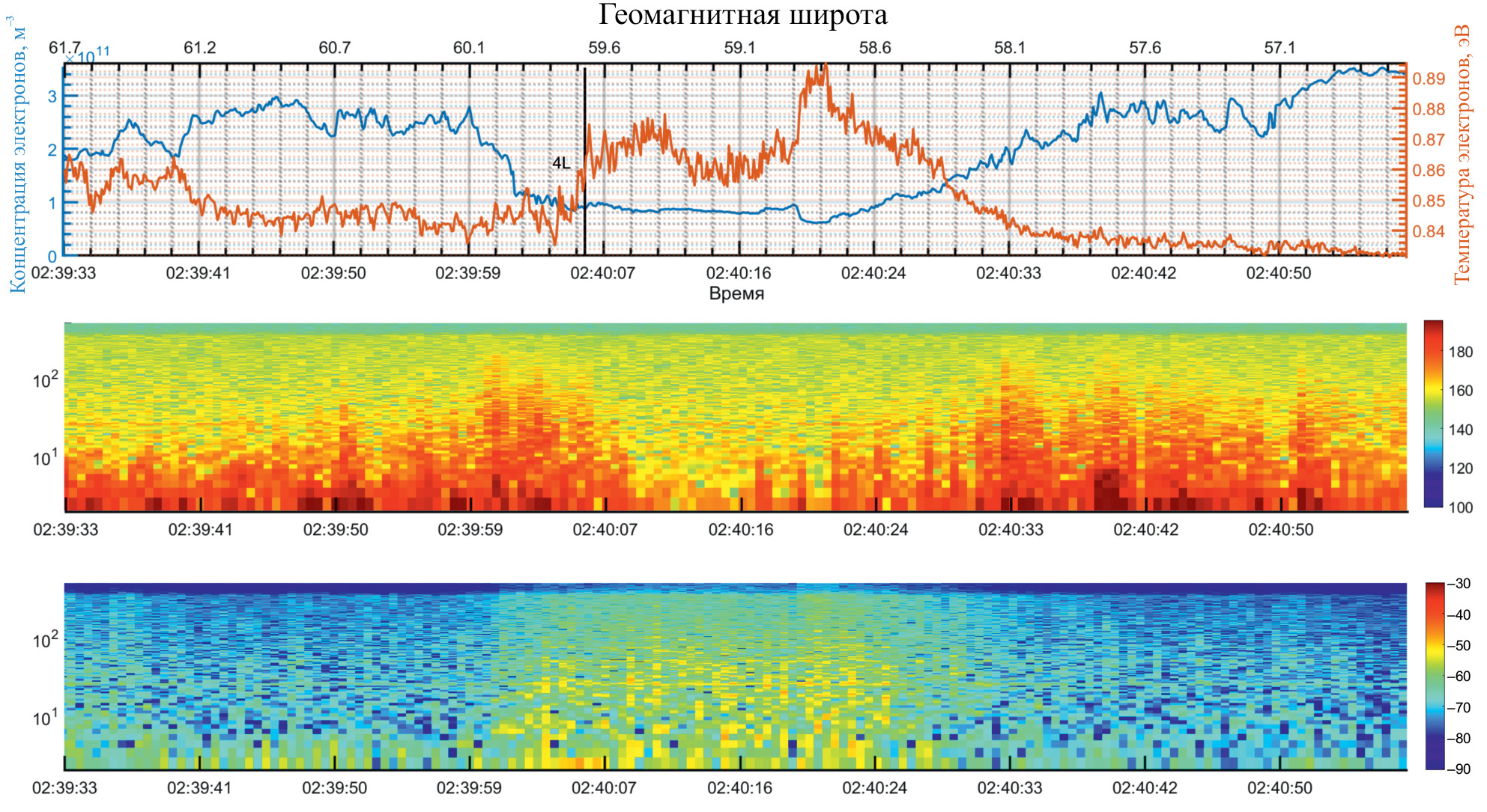 Рис. 3. Верхняя панель — изменение концентрации (синяя линия) и температуры (красная линия) электронов от геомагнитной широты (дипольная модель, 110 км) (верхняя ось абсцисс) и времени UT (нижняя ось абсцисс) по данным спутника NorSat-1 на высоте ~600 км во время геомагнитного события 14.03.2021 в 02 UT; средняя панель — спектрограмма мощности Фурье-преобразования электронной концентрации; нижняя панель — спектрограмма мощности Фурье-преобразования электронной температуры