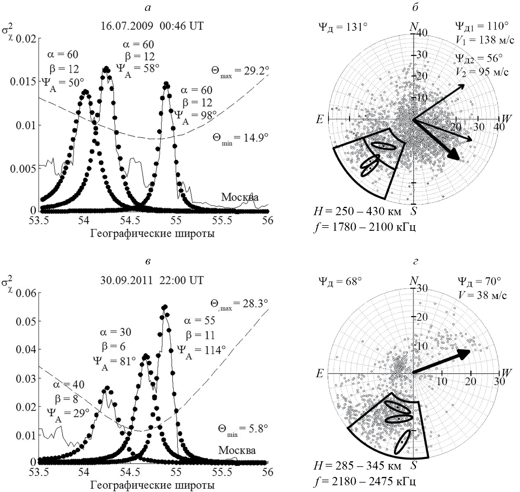 На рис. 1а и 1в приведены два примера аппроксимации одного максимума, в несколько раз превышающего уровень фона, в широтных профилях дисперсии логарифма относительной амплитуды σχ2. В радиосеансе 15 января 2010 г. при Кр = 2+ (см. рис. 1а) флуктуации рассеянного на неоднородностях радиосигнала наблюдались между 54.3° с.ш. и 55.3° с.ш. В радиосеансе 4 марта 2012 г. при Кр = 2– (см. рис. 1в) неоднородности были обнаружены между 53.5° с.ш. и 55.1° с.ш. Согласно модели трехмерно-анизотропных неоднородностей при 2° < Θmin < 20° ширина теоретического максимума определяется в основном вытянутостью неоднородностей вдоль α и перпендикулярно β к магнитному полю, а широтное положение максимума главным образом зависит от ориентации поперечной анизотропии ΨА. Параметры анизотропии α, β и ΨА, с которыми достигается наилучшая аппроксимация, приведены в левом верхнем углу каждого рисунка. Эти параметры считаются постоянными в широтно-долготной области, занимаемой максимумом. Пунктиром показан график значений углов между перемещающимся спутником и магнитным полем в точке наблюдения с указанием минимального (Θmin) и максимального (Θmax) значений. В работе [13] наглядно показано, что доверительный интервал величины ΨА составляет несколько градусов, если спутниковый пролет не является зенитным, т.е. Θmin > 2°. В рассматриваемых спутниковых сеансах это выполняется, что позволяет численно сопоставить ориентацию поперечной анизотропии ΨА с одновременным направлением дрейфа среднемасштабных неоднородностей.