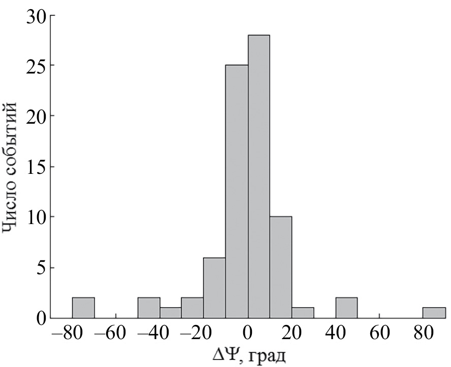 Рис. 4. Гистограмма различий между ориентацией поперечной анизотропии ΨA и направлением дрейфа ΨД для 80 случаев сопоставления этих экспериментальных данных