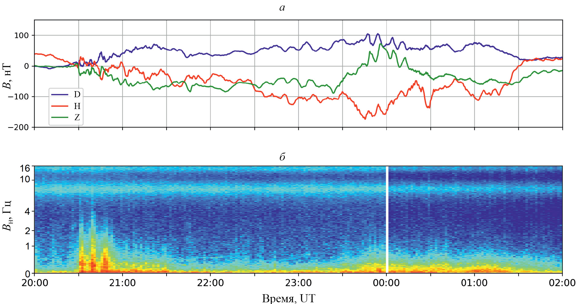 Наземные магнитометрические наблюдения в обсерватории “Ловозеро” Полярного геофизического института приведены на рис. 2. Бухта H-компоненты магнитного поля началась ~ 20:30 UT и продолжалась до 01:30 UT, в начале бухты наблюдались три вспышки магнитных пульсаций — в 20:30 UT, 20:37 UT и 20:47 UT. По наземным проявлениям в рассмотренном случае наблюдалась типичная авроральная суббуря: появление на севере спокойной дуги, ее дрейф к югу, расщепление дуги, быстрое увеличение яркости и расширение области свечения к северу и к югу (брейкап). Брейкап и расширение сияний к полюсу начался в 20:30 UT, после этого к югу от ярких дискретных сияний осталась широкая зона диффузных пульсирующих сияний, формируются несколько омега-структур (23:47 UT, 23:54 UT, 00:07 UT, 00:12 UT). После этого активность уменьшается, пульсирующие сияния смещаются к северу.