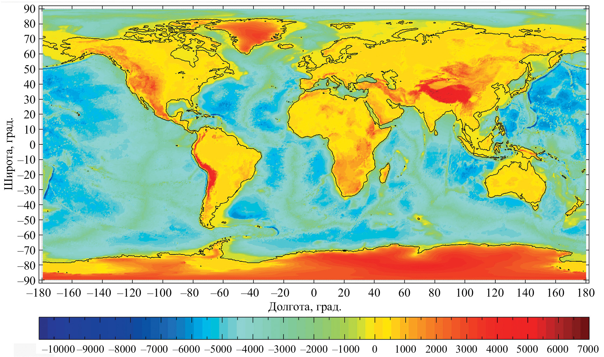 Рис. 1. Используемый в модели рельеф Земли. Цвет указывает отклонение от уровня поверхности океана в метрах