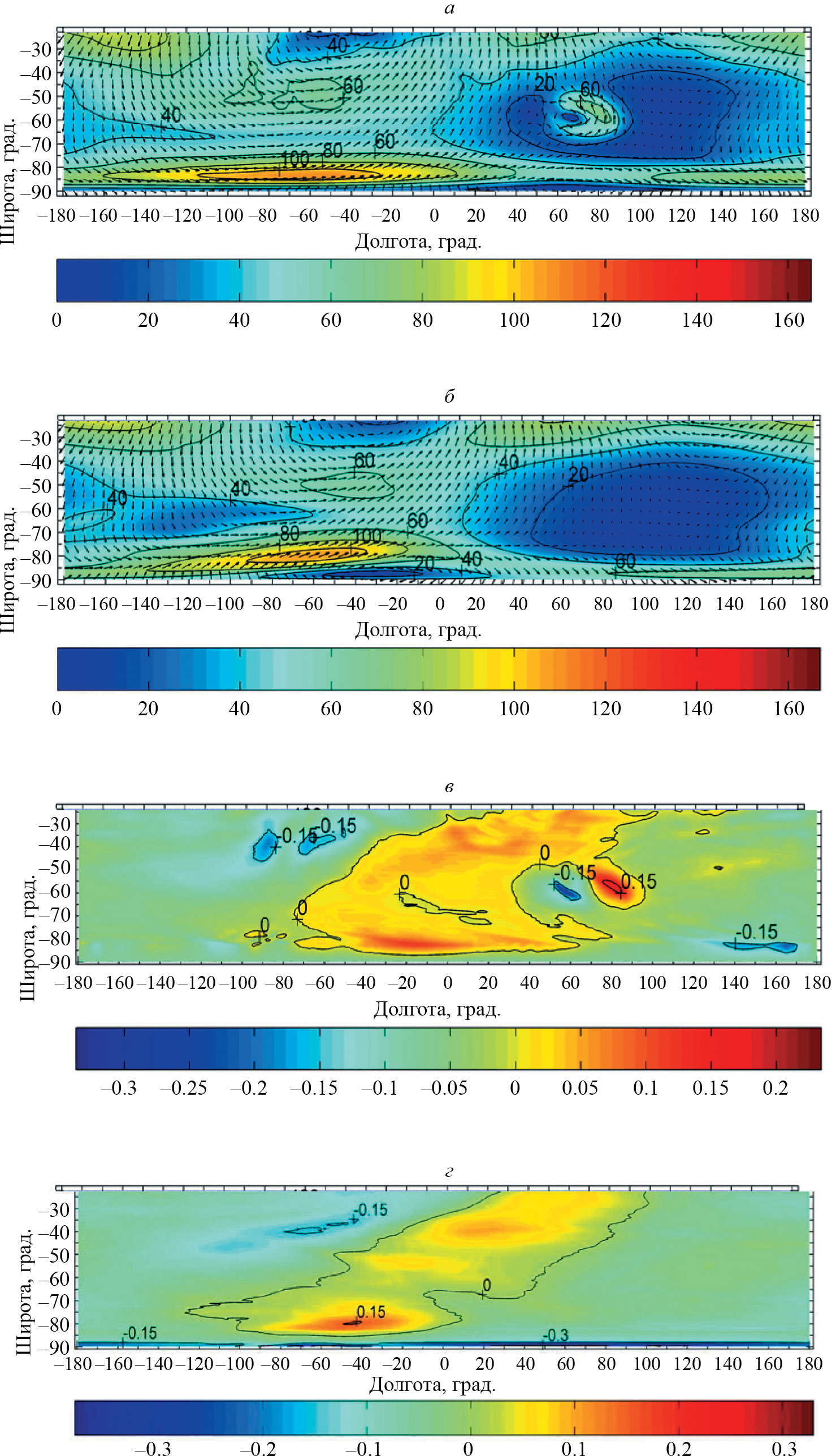 Видно, что результаты расчетов горизонтальной циркуляции атмосферы Южного полушария, полученные как с учетом рельефа, так и в приближении гладкой земной поверхности, на разных высотных уровнях нижней и средней атмосферы оказываются качественно похожими. Однако между ними обнаруживаются и определенные различия. Эти различия хорошо видны при сравнении панелей a и б на рис. 2 и 3.