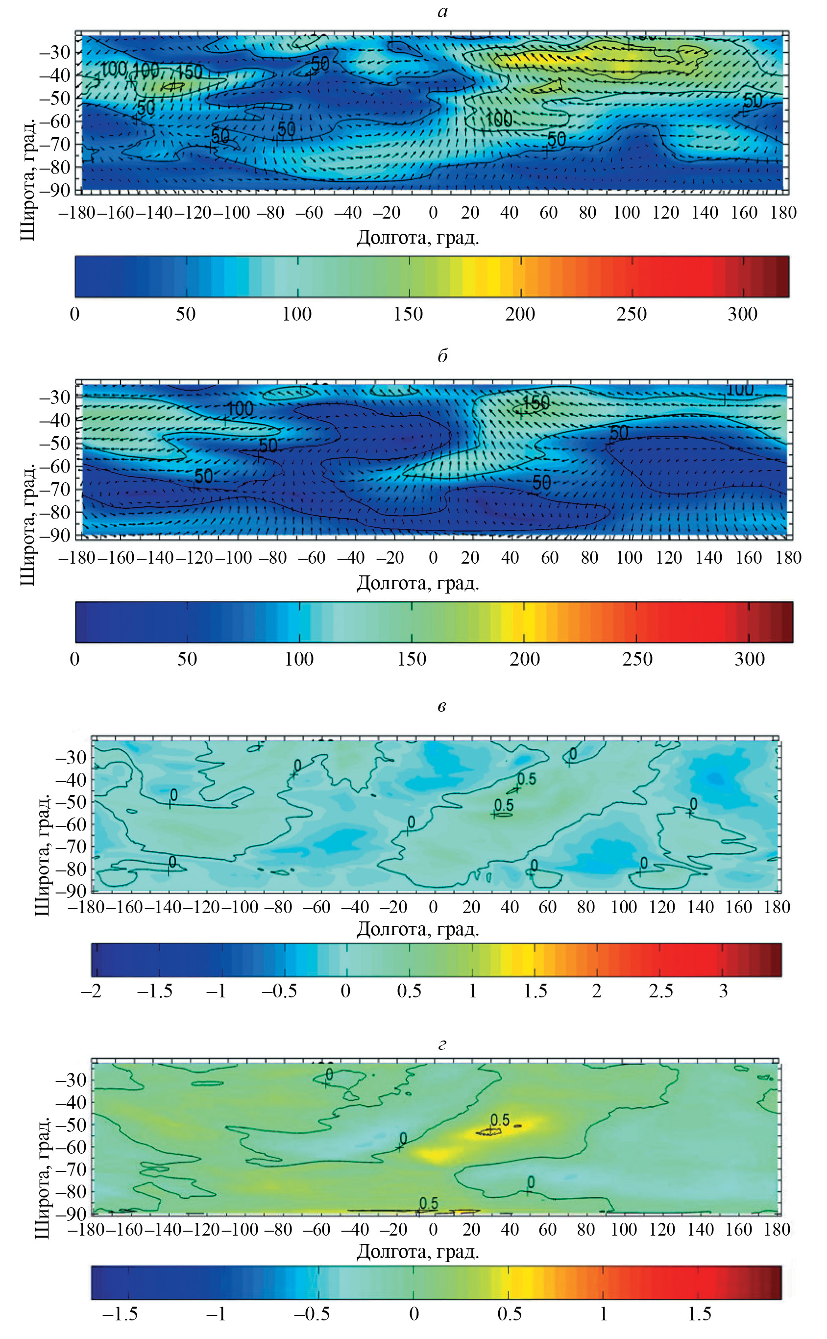 Рис. 2. Рассчитанные на высоте 20 км горизонтальные (a, б) и вертикальные (в, г) составляющие скорости атмосферного газа в Южном полушарии, полученные с учетом рельефа (a, в) и в приближении гладкой земной поверхности (б, г). Стрелки указывают направление, а цвет фона — величину скорости ветра, м/с; положительной считается направленная вверх вертикальная скорость