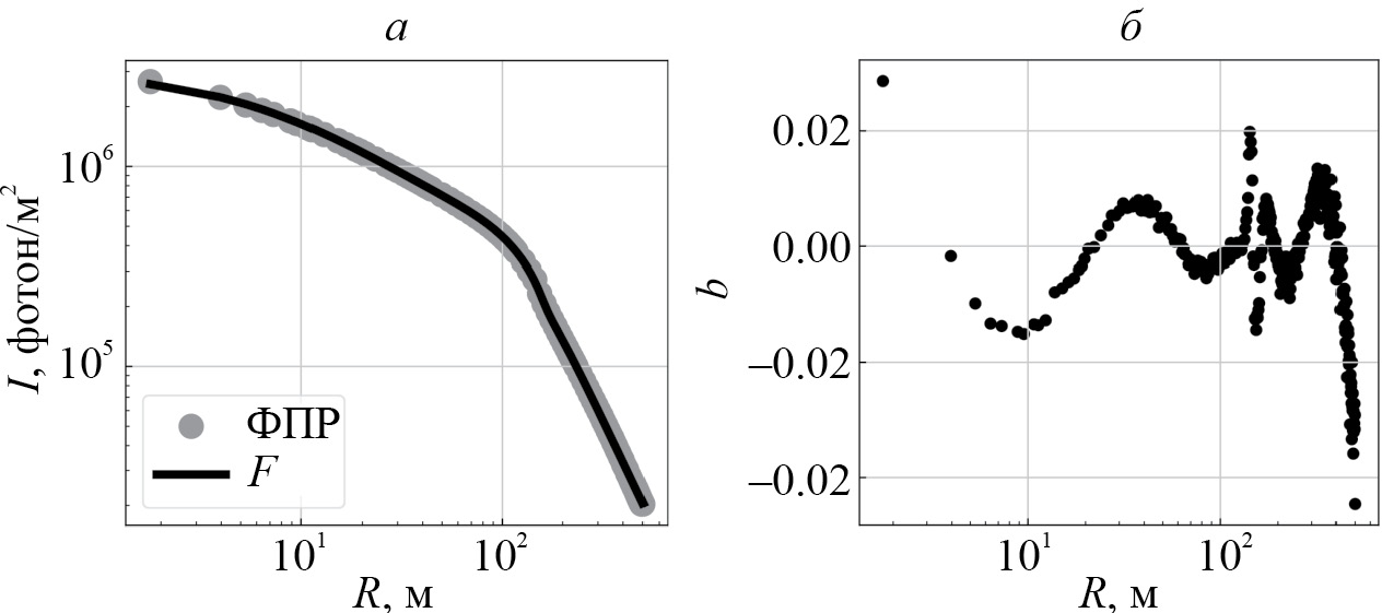 Рис. 2. Функция пространственного распределения черенковского света ШАЛ для индивидуального события ШАЛ (а). Серым отмечены точки моделирования I(R), кривой обозначена аппроксимирующая функция F по формуле (1). Относительное отклонение аппроксимирующей кривой F от смоделированных точек (б)