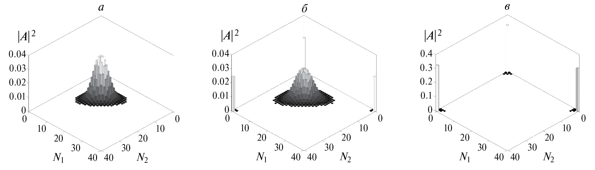 Численное решение уравнений (15)—(17) выявило наличие квантового фазового перехода при критическом значении управляющего параметра Λкр ≈ 3.3. При этом происходит переход системы от (атомно) когерентного состояния к когерентной суперпозиции фоковских состояний, близких к NооN-состоянию [31]. На рисунке 2 представлены распределения амплитуд основного состояния ТМСДК (10) вблизи критической точки Λкр. Для лучшей визуализации моделирование производилось при N = 40, все результаты экстраполируемы и на большее число частиц. Можно видеть, что при Λ < Λкр распределение гауссообразное, что характерно для когерентного состояния, см. рис. 2а. При Λ = Λкр происходит переход в трехмодовое запутанное фоковское состояние, когда все N частиц стремятся заселить состояния |N1, 0, 0>, |0, N2, 0> и |0, 0, N3>. В этом пределе как гауссоподобное, так и NооN-состояние ТМСДК обладают одинаковой энергией и сосуществуют в когерентной суперпозиции, см. рис. 2б. Наконец, при Λ > Λкр реализуется основное состояние ТМСДК — трехмодовое NооN-состояние, см. рис. 2в. Отметим, что с ростом N значение Λкр несколько увеличивается: для N = 20 было получено Λ = 3.30272 [32], тогда как для N = 40 Λ = 3.34087496. Кроме того, с ростом N фазовый переход становится более резким.