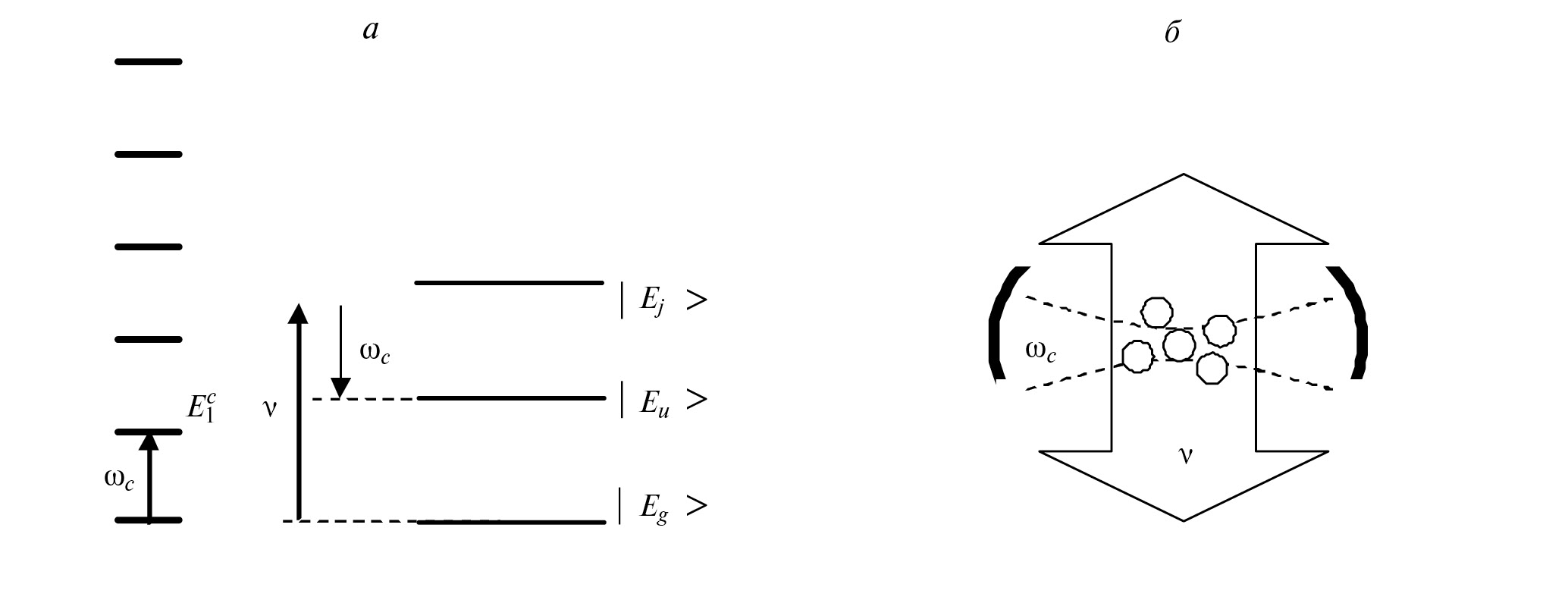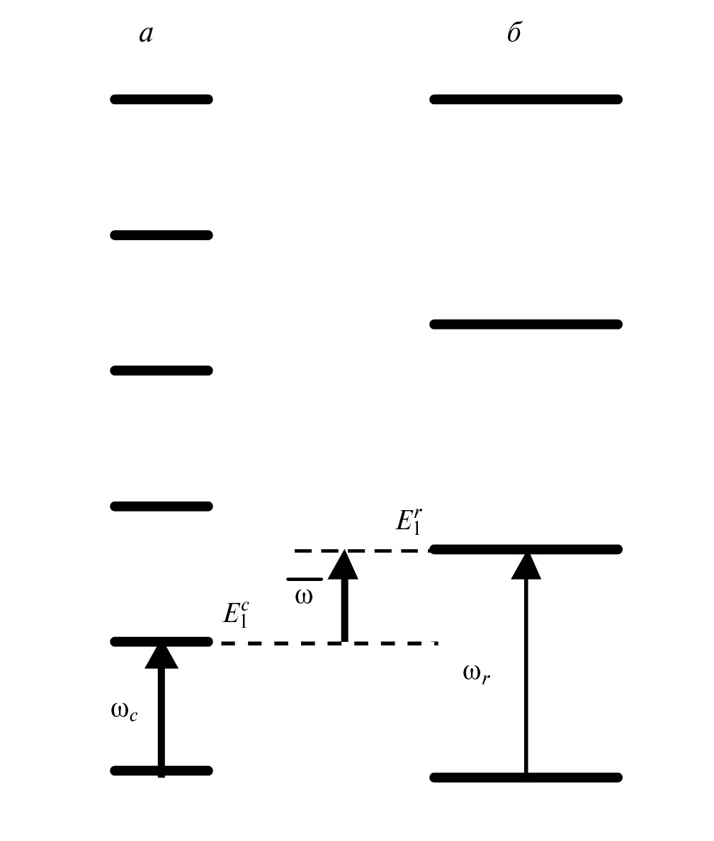 Рис. 1. Условие комбинационного резонанса и структура энергетических уровней атомов и фотонной моды (а), локализованных в микрорезонаторе (б), в случае (слева) воздействия внешней когерентной волны