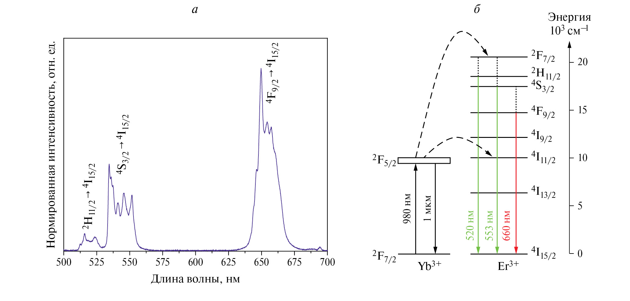 Спектры люминесценции (на рис. 2а) соответствуют излучательным релаксационным переходам ионов Er3+: 2H11/2 → 4I15/2 (520 нм), 4S3/2 → 4I15/2 (535 нм), 4F9/2 → 4I15/2 (660 нм). При этом возбуждение осуществляется на длине волны 980 нм, которая соответствует ближнему инфракрасному диапазону, что ясно свидетельствует об апконверсионном характере наблюдаемой люминесценции. Апконверсия является результатом двух- и трехфотонного поглощения ионом Yb3+ с переносом энергии на ион Er3+ по механизму кросс-релаксации. Эффективность переноса энергии между ионами обусловлена тем, что уровень 2F5/2 иона Yb3+ находится в резонансе с промежуточным метастабильным состоянием 4I11/2 иона Er3+ (рис. 2б). В результате происходит последовательное возбуждение иона Er3+ из основного состояния 4I15/2 сначала на уровень 4I11/2, а затем на уровень 4F7/2. Отметим также, что возможны промежуточные безызлучательные переходы на нижележащие уровни с последующими апконверсионными переходами и на более высоколежащие состояния [28].