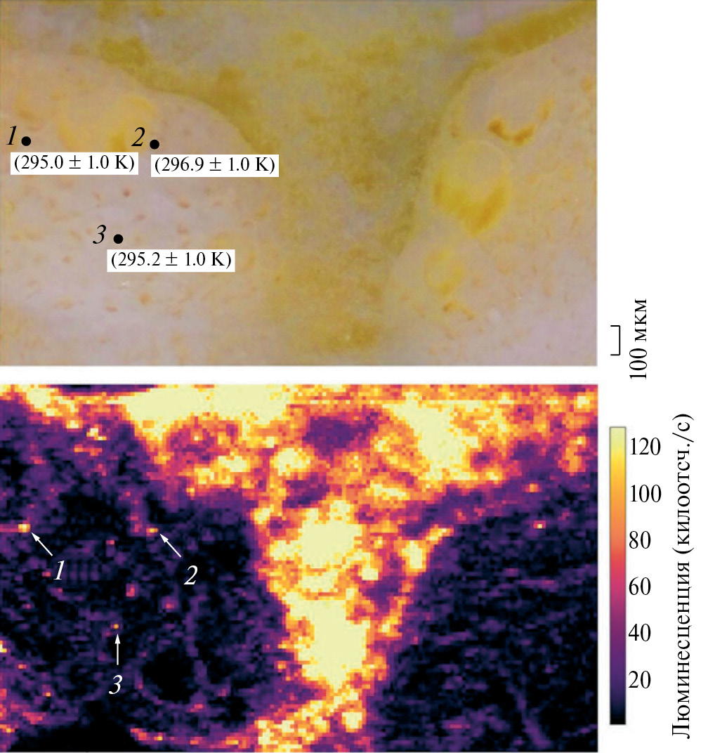 На основе определенной выше калибровочной кривой нами сделаны оценки температуры в трех локальных областях, обозначенных цифрами 1, 2, 3 на рис. 4. Результаты сопоставления отношения интегральных интенсивности RHS с калибровочной кривой дали следующие значения температуры: 295.0, 296.9 и 295.2 K. Учитывая величину погрешности измерения ±1.0 K, можно заключить, что температура на поверхности препарата близка к 296±1.0 K. Данное значение полностью согласуется с результатами измерения температуры физиологического раствора в препарате терморезистором 23±0.5 °C.