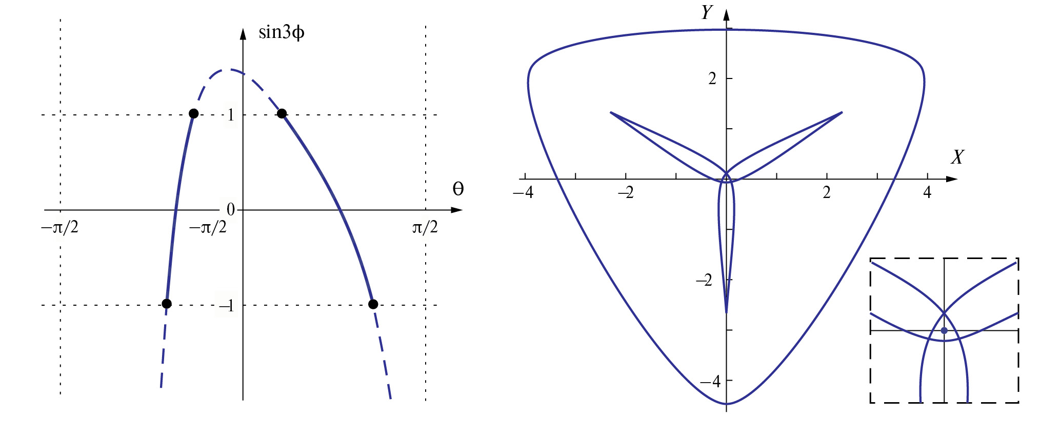 Рис. 1. Слева: интервалы по θ, для которых существует решение φ(θ) уравнения (15), справа: каустика , , которая получается из формул (13) при . Увеличенный фрагмент центральной части показывает наличие каустической точки, которая присутствует только в плоскости автофокусировки