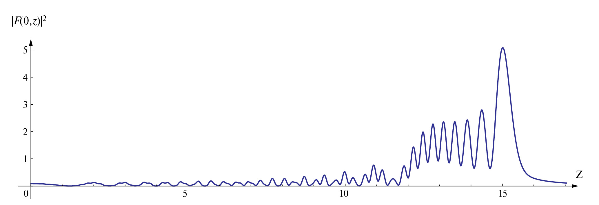 Рис. 2. График зависимости интенсивности пучка Ai3(x, y, a) на оси z (т. е. при x = y = 0) при распространении в зоне Френеля для случая, когда параметр смещения равен . Асимптотическая формула (14) дает значение zs = 14.35, из численного эксперимента получается zs = 15.012