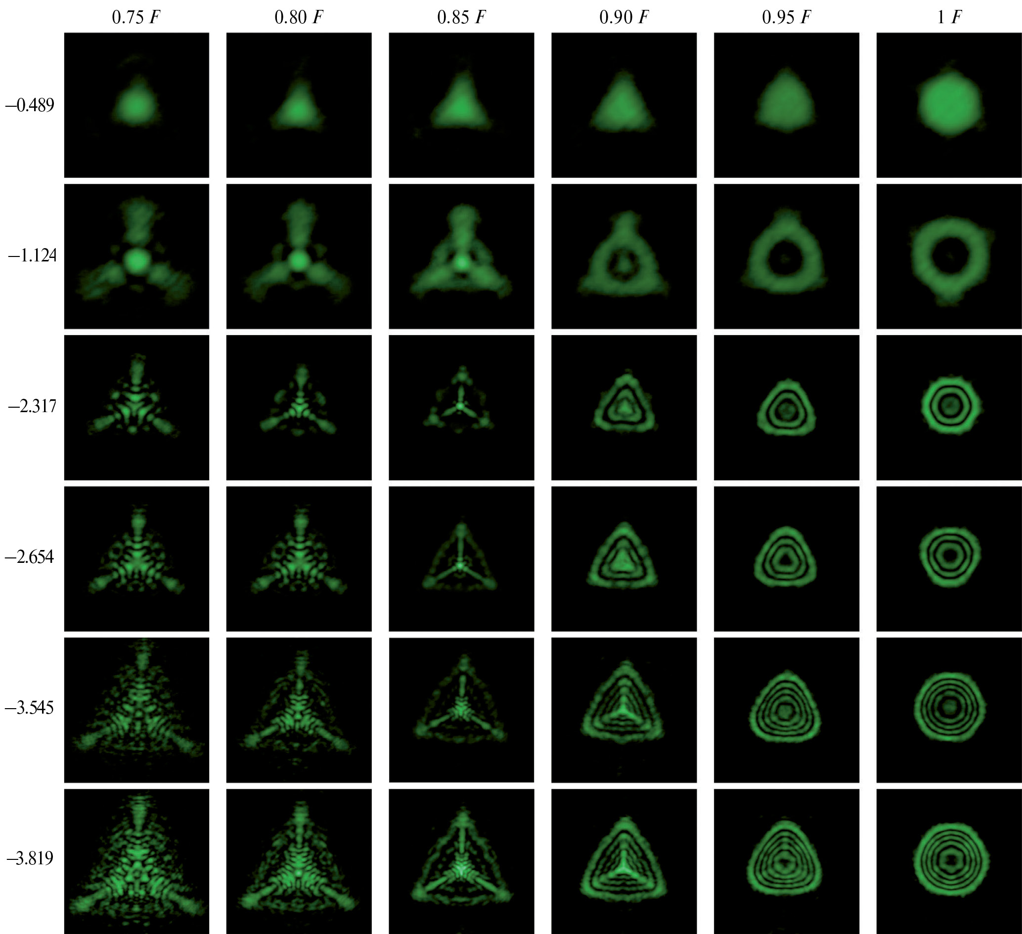 Полученные в ходе проведенных экспериментов распределения интенсивности три-Эйри пучков с различным значением параметра смещения а представлены на рис. 4. Наблюдаются характерные изменения в структуре распределения интенсивности три-Эйри пучков при распространении. Можно выделить две большие области, разделенные АФ-плоскостью, отличающиеся типом структуры распределения интенсивности формируемого поля. Между начальной плоскостью (плоскостью ЖК ПМС в эксперименте) и АФ-плоскостью интенсивность имеет вид набора пятен, собранных в область треугольной формы. Между плоскостями автофокусировки и Фурье распределение интенсивности имеет вид концентрических фигур: ближе к АФ-плоскости треугольных, в плоскости Фурье (фокальной) — набор колец, очень похожий внешне на моду Лагерра‒Гаусса, но с супергауссовым убыванием по интенсивности. Наиболее ярко описанные изменения наблюдаются в структуре интенсивности три-Эйри полей с большим абсолютным значением параметра смещения а (a3 × 3–2/3, × 3–2/3, a5 × 3–2/3 и × 3–2/3; см. 3–6 строки на рис. 4). При плоскости автофокусировки нет (верхний ряд на рис. 4). С ростом |a| и появлением АФ-плоскости ее положение начинает смещаться в сторону Фурье-плоскости. Для a = a1 × 3–2/3 = –1.124 наблюдается довольно протяженная область локализации поля на оси, с наиболее ярким пятном в плоскости 0.8 F. Для a = a3 × 3–2/3 = –2.654 АФ-плоскость находится на расстоянии 0.85F, для a = a5 × 3–2/3 = –3.819 — на расстоянии 0.88F. Отмеченная закономерность согласуется с предсказанием теории (14). Плоскость автофокусировки с увеличением |а| стремится приблизиться к Фурье плоскости (плоскости 1F на рис. 4).