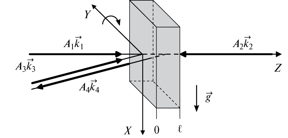 Рассмотрим вырожденный ЧПИ со встречными волнами накачки A1 и A2 (рис. 1). Амплитуды сигнальной и объектной волн равны соответственно A3 и A4. Волновые векторы всех волн , где j ∈ [1; 4]. Распространение волн в плоском слое наносуспензии, заключенном между плоскостями z = 0 и z = ℓ, возможно как ортогонально [19, 29—31], так и коллинеарно (при повороте схемы на рис. 1 вокруг оси Y на 90°) [20, 32, 33] полю тяжести, действующему на наночастицы и характеризующимся направлением ускорения свободного падения .