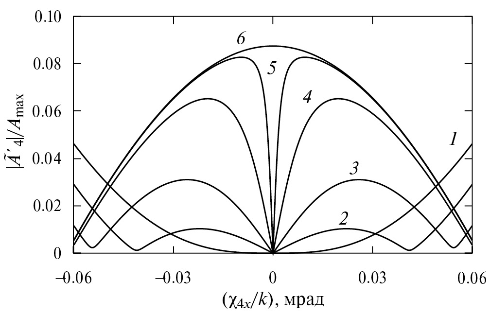 На рис. 2 для случая монодисперсной наносуспензии представлены модули ПСОВ вблизи провала, который наблюдается на нулевой пространственной частоте [17—19], при различных углах наклона наносуспензии и схемы ЧПИ. Видно, что отклонение угла θ от нуля приводит к появлению вблизи провала тонкой структуры: наряду с нулевым значением модуля ПСОВ на нулевой частоте возникают два симметрично расположенных минимума и, как следствие, два побочных максимума равной величины, которую обозначим как Aside, на пространственных частотах χside. Вплоть до величины θ = 60° (рис. 3, кривая 1) увеличение θ сопровождается смещением побочных максимумов в область больших (по модулю) пространственных частот, после чего они с большей скоростью движутся обратно и при θ = 90° сливаются в один максимум (рис. 2, кривая 6), который также наблюдался в работах [20, 21]. При этом при θ = 90° минимальные значения модуля ПСОВ равны нулю.