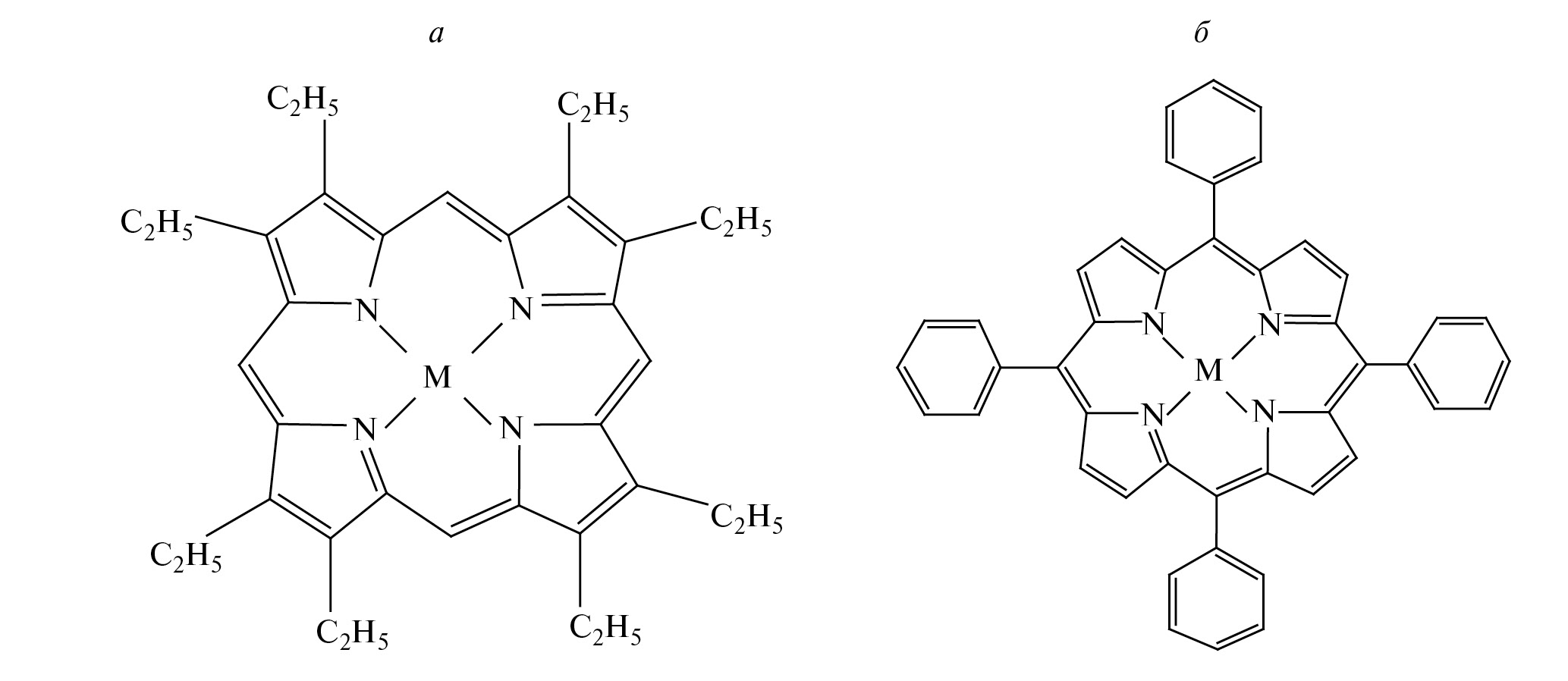 Рис. 1. Структурные формулы 2,3,7,8,12,13,17,18-октаэтилпорфирина (а) и 5,10,15,20-тетрафенилпорфирина (б), где M = Pd- и Pt-