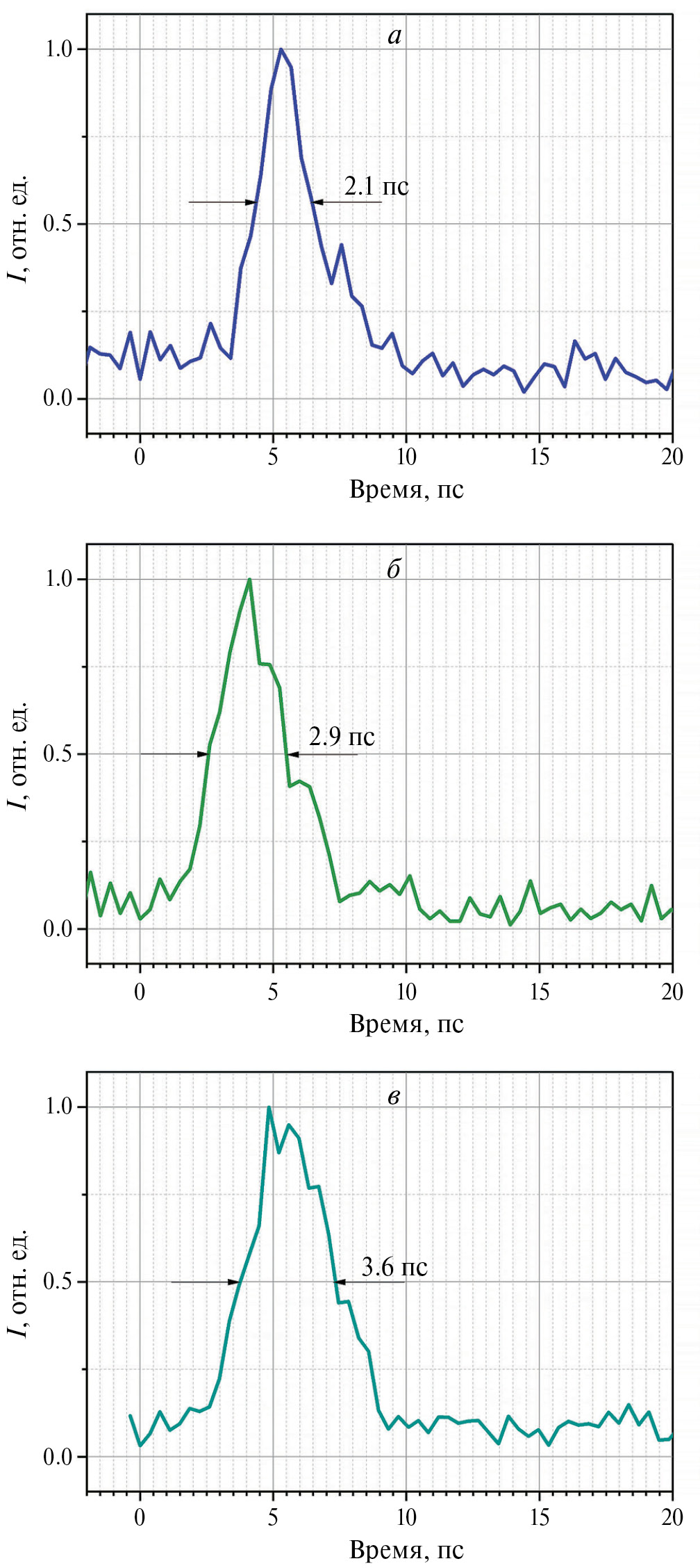 Рис. 2. Экспериментально измеренные длительности импульсов генерации при F = 15 (а), 30 (б) и 40 см (в). P = 30 мбар. E = 6 мДж. Нулевая точка соответствует времени прихода импульса накачки
