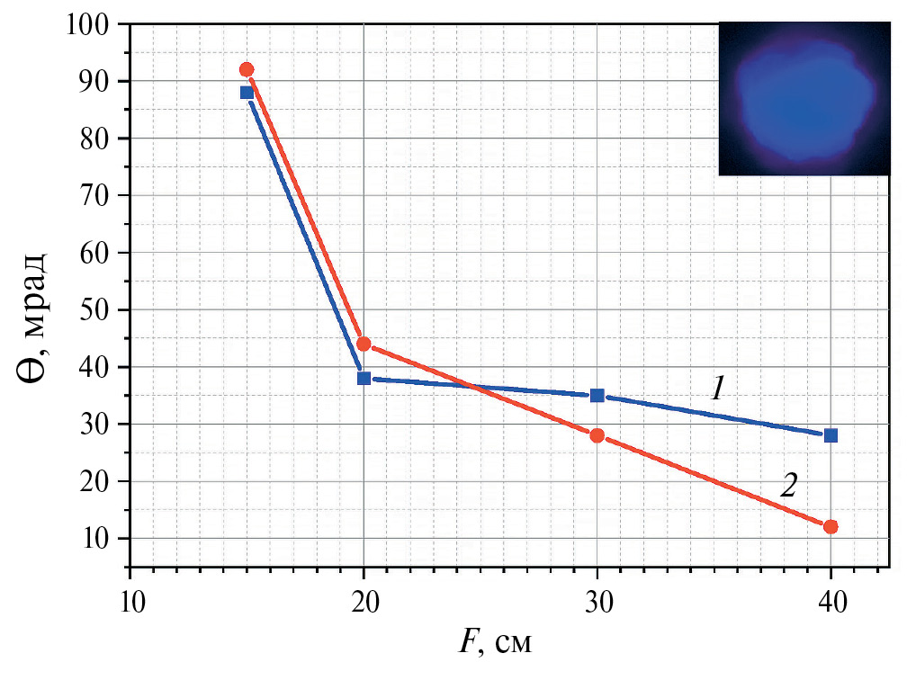 Рис. 3. Зависимость экспериментальной (1) и оценочной (2) расходимости излучения от фокусного расстояния линзы. На вставке показан профиль пучка на длине волны 391.4 нм в дальней зоне. E = 8 мДж, P = 30 мбар
