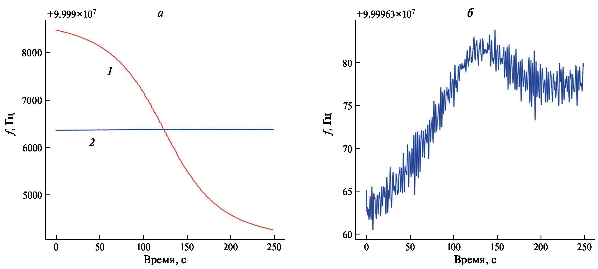 Рис. 3. Сравнение частот следования сигналов, полученных в ходе моделирования сеанса КРК, до (1) и после (2) приближенной компенсации влияния эффекта Доплера (a). Частота следования квантовых сигналов после компенсации эффекта Доплера (б)