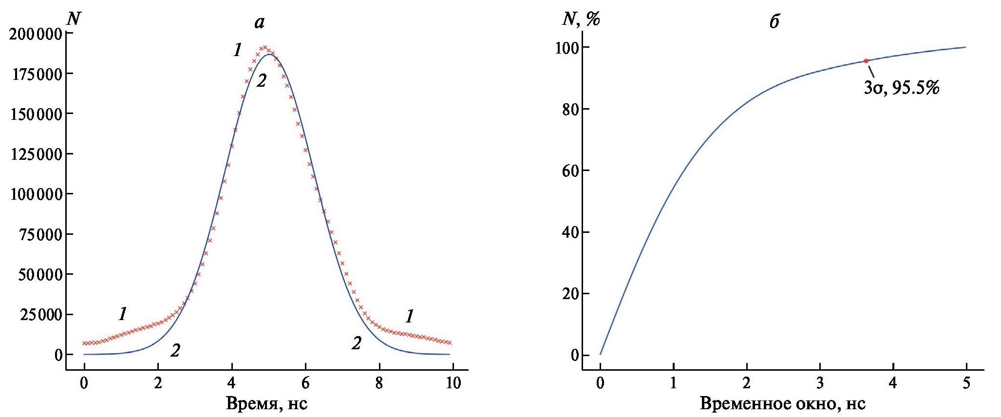 На рис. 4б. представлен график количества сигналов, попадающих во временное окно фильтрации в зависимости от его ширины. Внутри временных ворот ±3σ содержится 95.5 % зарегистрированных сигналов.