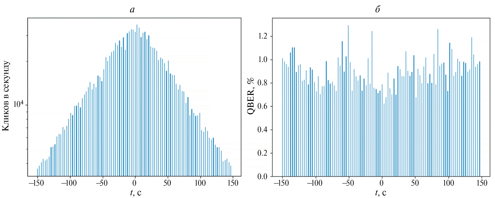 Рис. 2. Гистограммы зависимости количества полученных кликов (а) и процента квантовых битовых ошибок (QBER) в них (б) для случая значительных флуктуаций, которые могут быть связаны с нестабильностью работы экспериментального оборудования и плохими погодными условиями