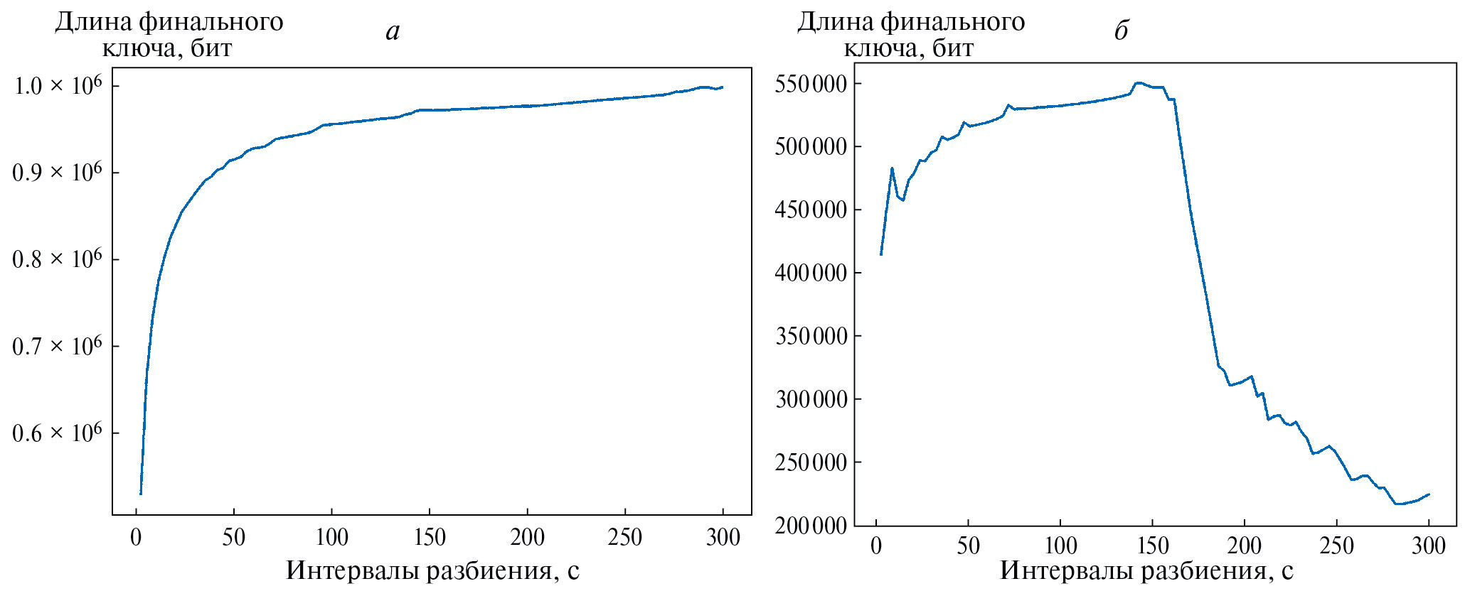 Рис. 3. Графики зависимости длины финального ключа в зависимости от размера отрезков разбиения интервала сеанса связи в случае небольших флуктуаций (а) и для больших отклонений (б) числа кликов от теоретического среднего