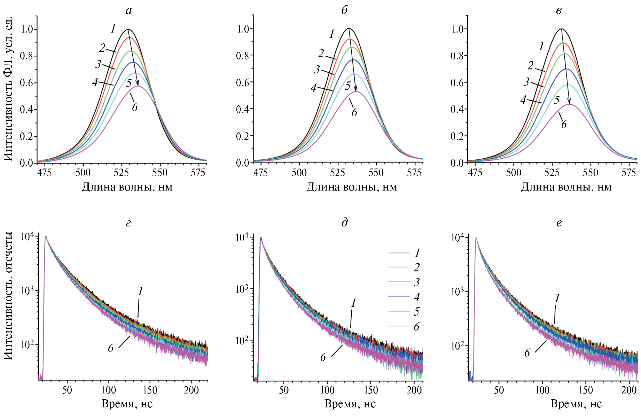 Тенденция к увеличению тушения с ростом температуры наблюдается и в кривых затухания, представленных на рис. 3г‒е. Найденные средние времена жизни ФЛ падают приблизительно на 25 % для квантовых точек во всех исследуемых системах.
