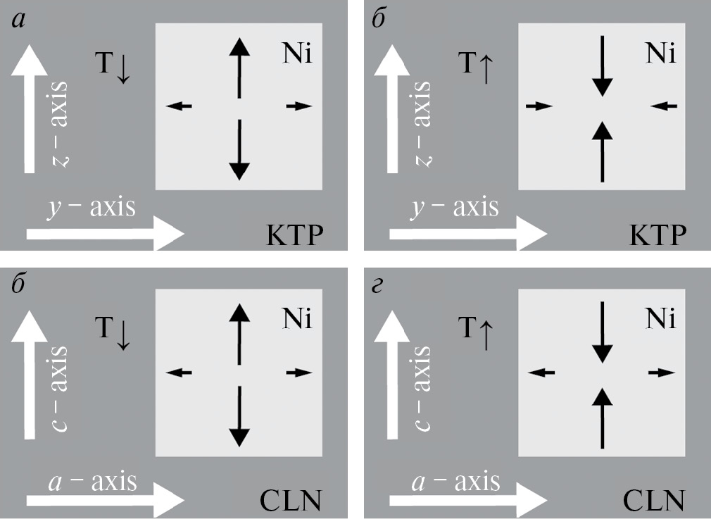 В качестве подложки использовались прямоугольные монокристаллические подложки из KTP и CLN размером 3×2 мм и толщиной 1 мм. Для KTP длинная сторона подложки совпадала с кристаллографической осью y, короткая — с осью z. Согласно данным производителя (Crystal Technology Inc.) термические коэффициенты расширения вдоль этих осей составляли αy = 9·10–6 °C–1 и αz = 0.6·10–6 °C–1 соответственно. Для CLN подложек длинная сторона совпадала с кристаллографической осью а, короткая — с осью с. Термические коэффициенты расширения вдоль этих осей составляли α1 = 15·10–6 °C–1 и α3 = 7.5·10–6 °C–1 соответственно. Разница этих коэффициентов друг с другом и с коэффициентом термического расширения поликристаллического Ni: αp = 13·10–6 °C–1 [19], позволила создавать одноосные деформации в микрочастицах (рис. 1). При охлаждении КТР подложек ниже температуры напыления микрочастиц, абсолютное значение их одноосного растяжения вдоль оси z подложки должно было составить ε = ΔT·8.4·10–6 °C–1 (рис. 1а), где ΔT — изменение температуры образца. При нагреве должно было происходить такое же по абсолютному значению сжатие (рис. 1б). На CLN подложках при охлаждении должно было происходить растяжение микрочастиц вдоль оси с с абсолютной величиной ε = ΔT·7.5·10–6 °C–1 (рис. 1в), а при нагреве должно было происходить сжатие (рис. 1г). Таким образом можно было создавать одноосные механические напряжения в микрочастицах и контролировать их за счет изменения температуры образца. В качестве контрольного образца Ni микрочастицы были сформированы на поверхности стеклянной подложки, которая имела изотропный коэффициент термического расширения αg = 9·10–6 °C–1.