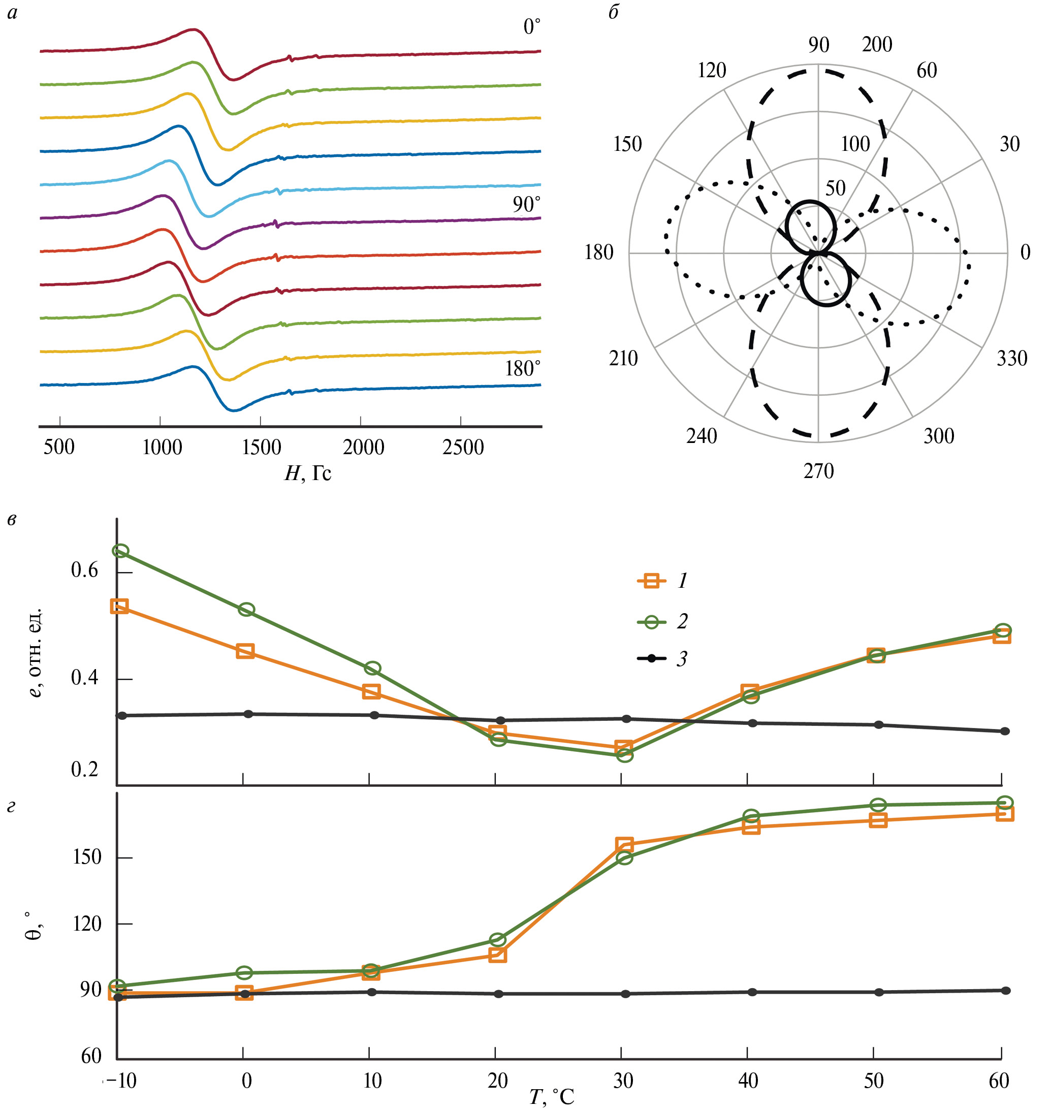 Рис. 2. ФМР спектры микрочастиц Ni на KTP при различных углах ориентации относительно магнитного поля при температуре 60 °C (а). Угловая зависимость резонансного поля в полярных координатах для микрочастиц Ni на KTP при температурах (б): –10 °C (пунктирная кривая), +20 °C (сплошная кривая) и +60 °C (кривая с точками); значения резонансных полей для каждой кривой нормированы на минимальное значение резонансного поля при данной температуре. Зависимости эксцентриситета углового отклонения резонансного поля от температуры (в). Зависимости угла направления оси термоиндуцированной магнитной анизотропии от температуры (г). 1 — KTP, 2 — CLN, 3 — стеклянная подложка.