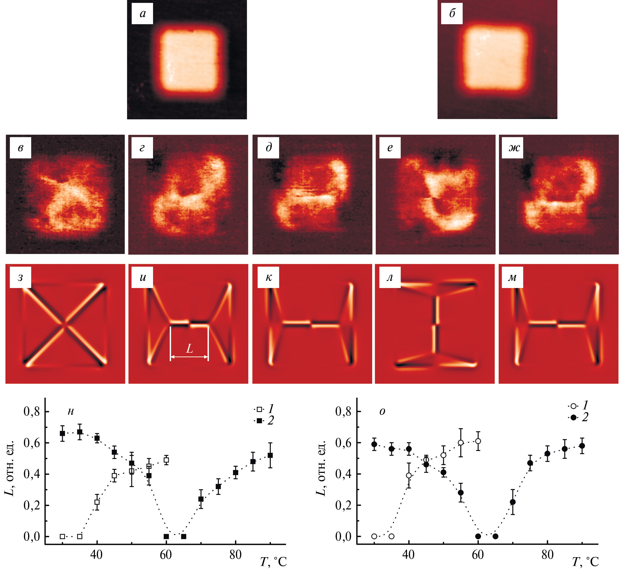 Рис. 3. АСМ изображения отдельной Ni микрочастицы на KTP подложке, сформированной при комнатной температуре (а) и при 60 °C (б). Размер поля сканирования 11×11 мкм. Градации цвета соответствуют размаху высоты 35 нм. МСМ изображения микрочастицы а, полученные при 30 °C — в, 45 °C — г, 60 °C — д, и соответствующие им виртуальные МСМ изображения — з, и, к; микрочастицы б, полученные при 30 °C — е, 90 °C — ж, и соответствующие им виртуальные МСМ изображения — л, м. Градации цвета соответствуют размаху фазы 0.5°. Зависимость длины стенки между двумя увеличенными доменами (L) от температуры для образцов, приготовленных на KTP — н и CLN — о. Цифрой 1 обозначены данные для микрочастиц, сформированных на подложках при комнатной температуре, цифрой 2 — при 60 °C.