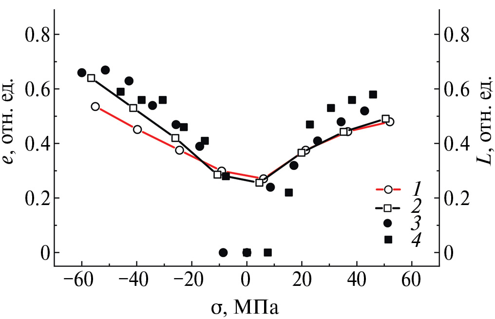 Рис. 4. Зависимость эксцентриситета углового отклонения резонансного поля (e, левая ось ординат) и приведенной длины стенки между двумя увеличенными доменами (L, правая ось ординат) от действующего на микрочастицу механического напряжения. 1 — точки и кривая эксцентриситета для микрочастиц на кристалле KTP; 2 — точки и кривая эксцентриситета для микрочастиц на кристалле CLN; 3 — длина перемычки, нормированная на длину микрочастицы на кристалле KTP; 4 — длина перемычки, нормированная на длину микрочастицы на кристалле CLN.
