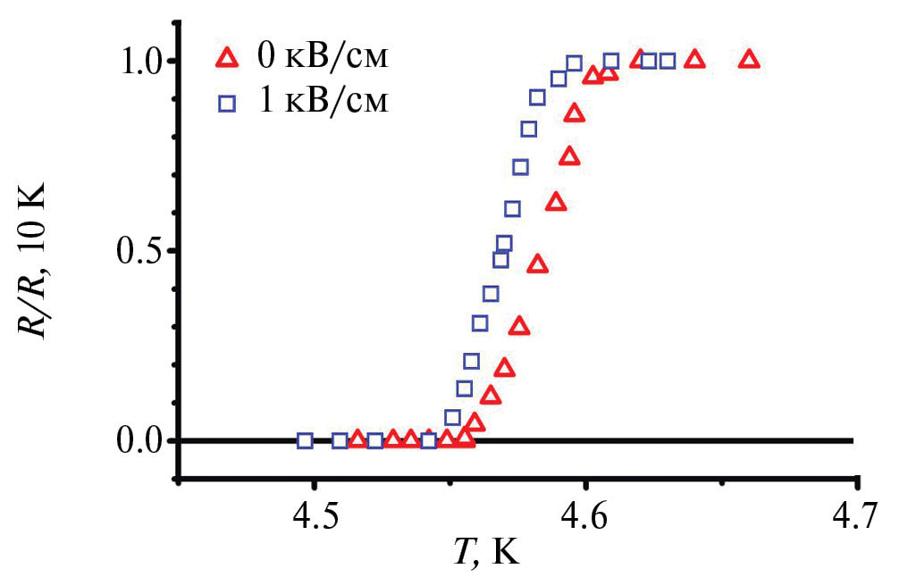 Рис. 2. Кривые сверхпроводящих переходов для образца PMN-PT/Co1(3 нм)/Cu(4 нм)/Co2(1 нм)/Cu(1.2 нм)/Pb(60 нм)/ /Si3N4, измеренные без электрического поля и с приложением электрического поля напряженностью 1 кВ/см.
