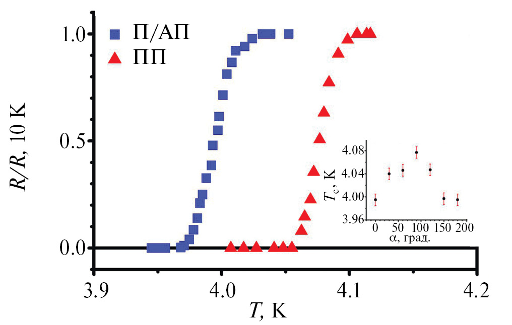 Рис. 3. Кривые сверхпроводящих переходов для образца PMN-PT/Co1(3нм)/Cu(4нм)/Co2(1нм)/Cu(1.2нм)/Pb(60нм)/Si3N4, измеренные при коллинеарной и ортогональной (ТсПП) ориентации намагниченностей Ф-слоев во внешнем магнитном поле H0 = 1 кЭ. На вставке изображена зависимость Тс от угла α между намагниченностями Ф-слоев во внешнем магнитном поле H0 = 1 кЭ.