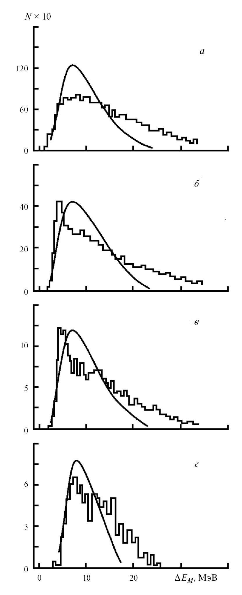 Рис. 3. Экспериментальные и расчетные спектры энерговыделений в “живой” мишени при регистрации тритонов в энергетических интервалах: а) 10—20; б) 20—30; в) 30—40; г) 40—50 МэВ. Кривые — расчет, гистограммы — результаты эксперимента.