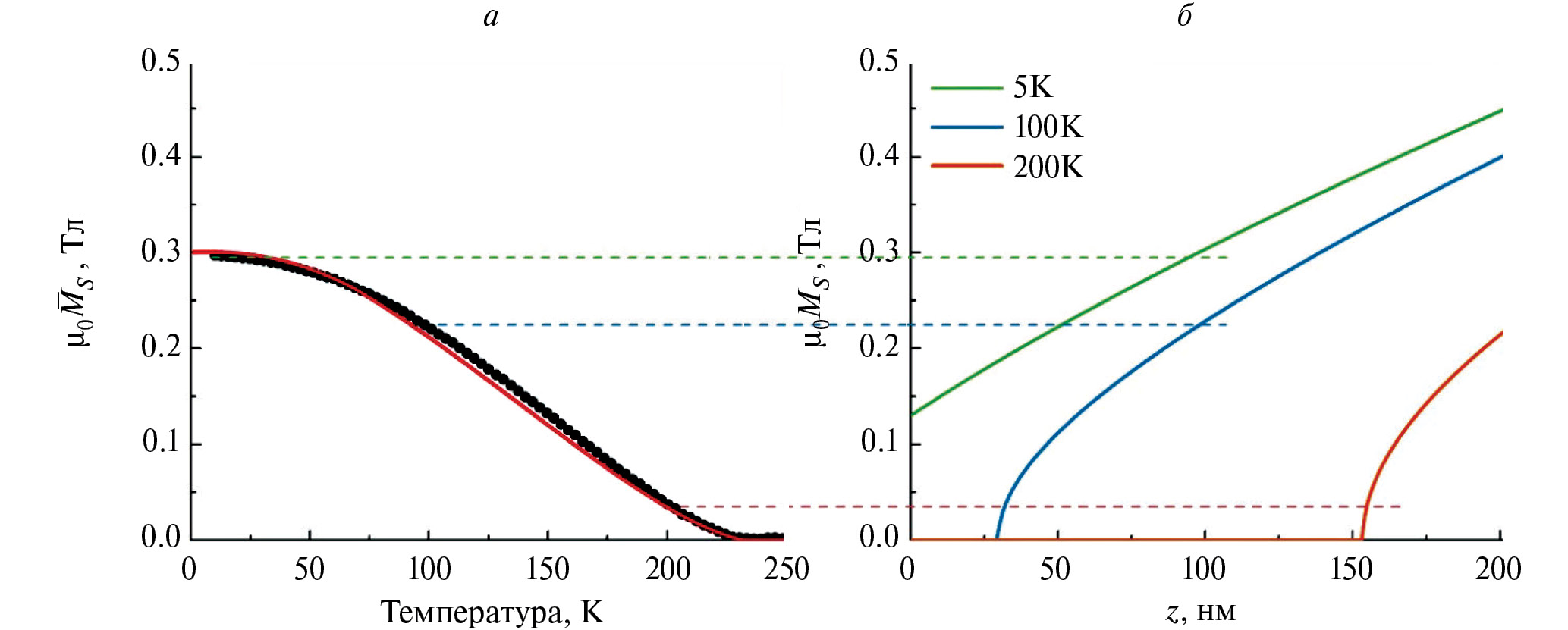 Рис. 2. Зависимость средней намагниченности пленки (а) и профиля локальной намагниченности внутри пленки (б) от температуры. Точки — эксперимент, линии — модель.