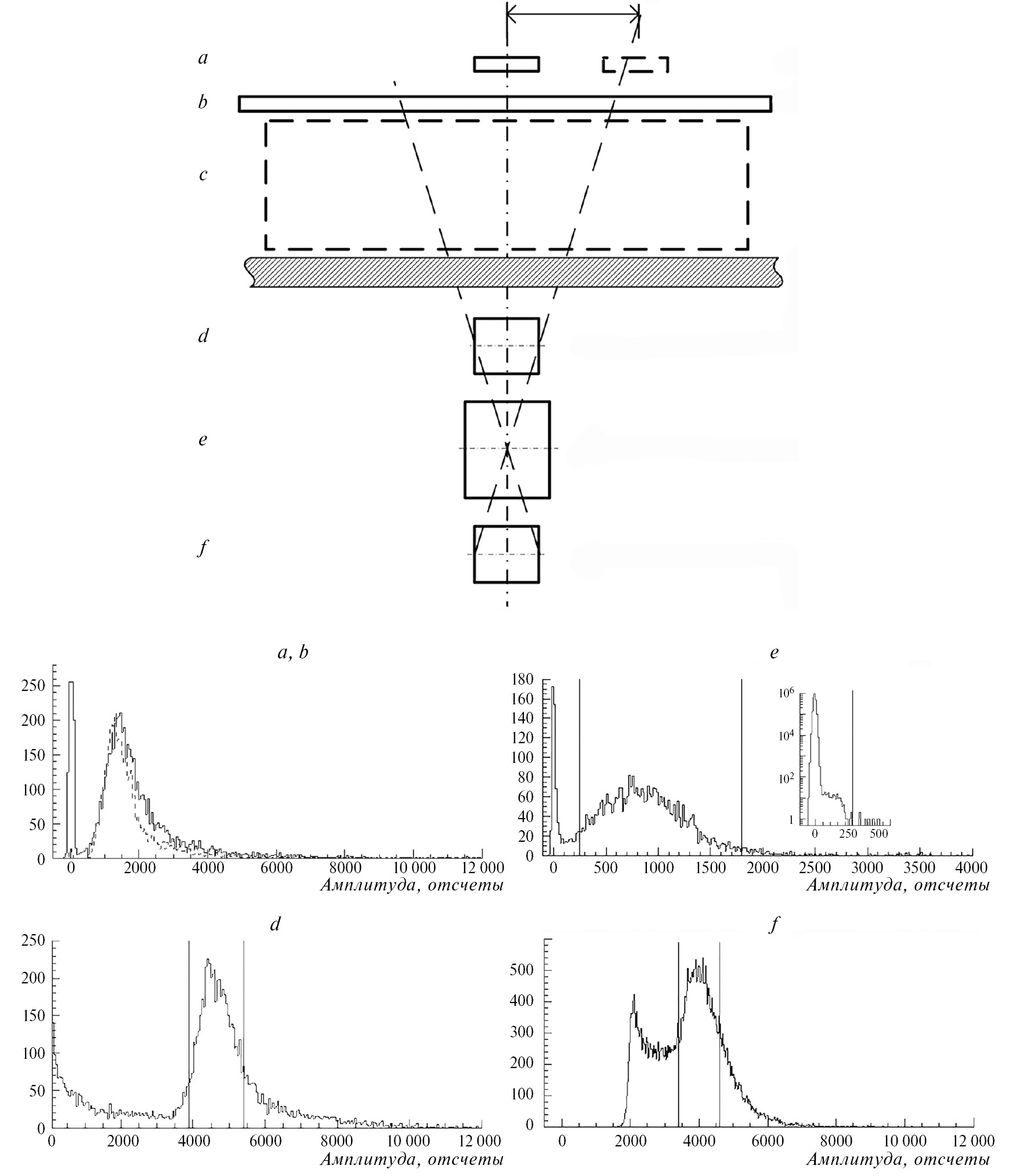 Рис. 1. Схема применения годоскопа заряженных космических частиц (в основном мюонов) и амплитудные распределения импульсов отдельных детекторов. a, b, d, f — пластиковые сцинтилляционные детекторы; c, e — тестируемый и малый (селектор) пороговые черенковские детекторы соответственно.