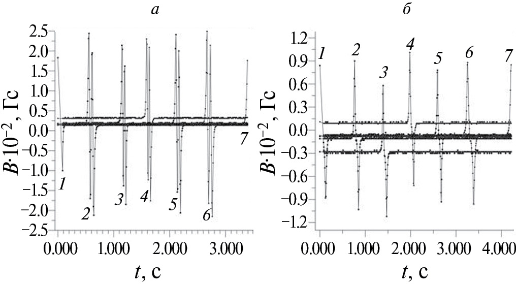 5. Fig. 4. Oscillogram of the signal B(t) from the Hall sensors in the experiment with a magnetic body (Fig. 2c) (a), covered with MF No. 1; the same in the experiment with the body (Fig. 2d) (b).