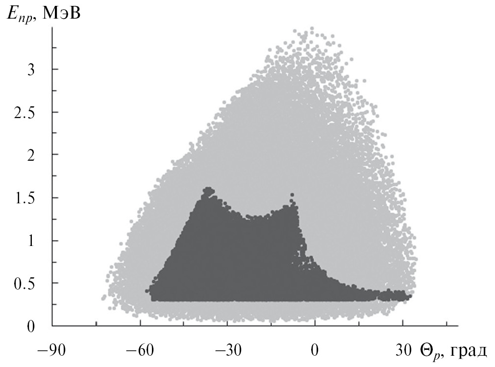 Рис. 3. Двумерная диаграмма Ep — Θp реакции n + 2H → n1 + (np) → n1 + n2 + p. Параметры моделирования: E0 = 5±1 МэВ, ε0 = 0.04 МэВ, Θn1 = 45°±2.5° (серые точки) и E0 = 5±1 МэВ, ε0 = 0.04 МэВ, Θn1 = 45°±2.5°, Θn2 = –25°±2.5°, En1 ≥ 0.3 МэВ, En2 ≥ 0.3 МэВ, Ep ≥ 0.3 МэВ (темно-серые точки).