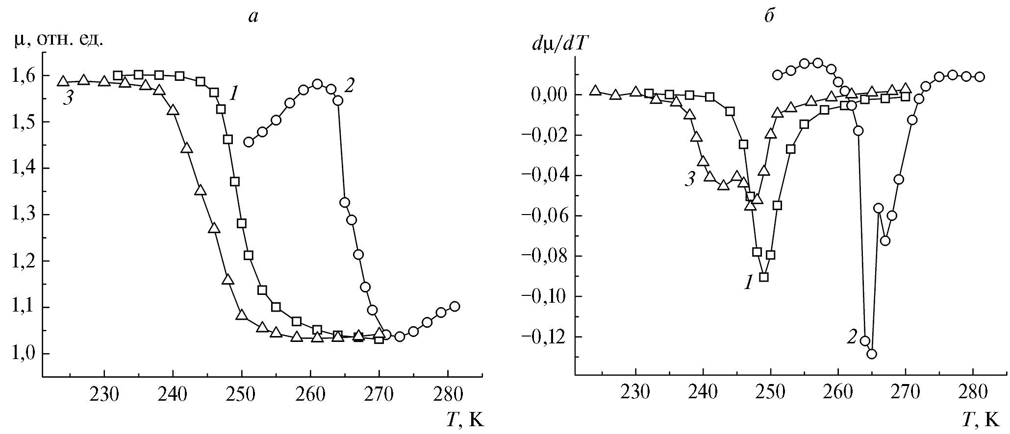 Рис. 1. Температурные зависимости магнитной проницаемости (а) и производной dμ/dT (б) манганитов, содержащих (Fe, Zn) — 1, (Fe, Co) — 2, (Fe, Mg) — 3.